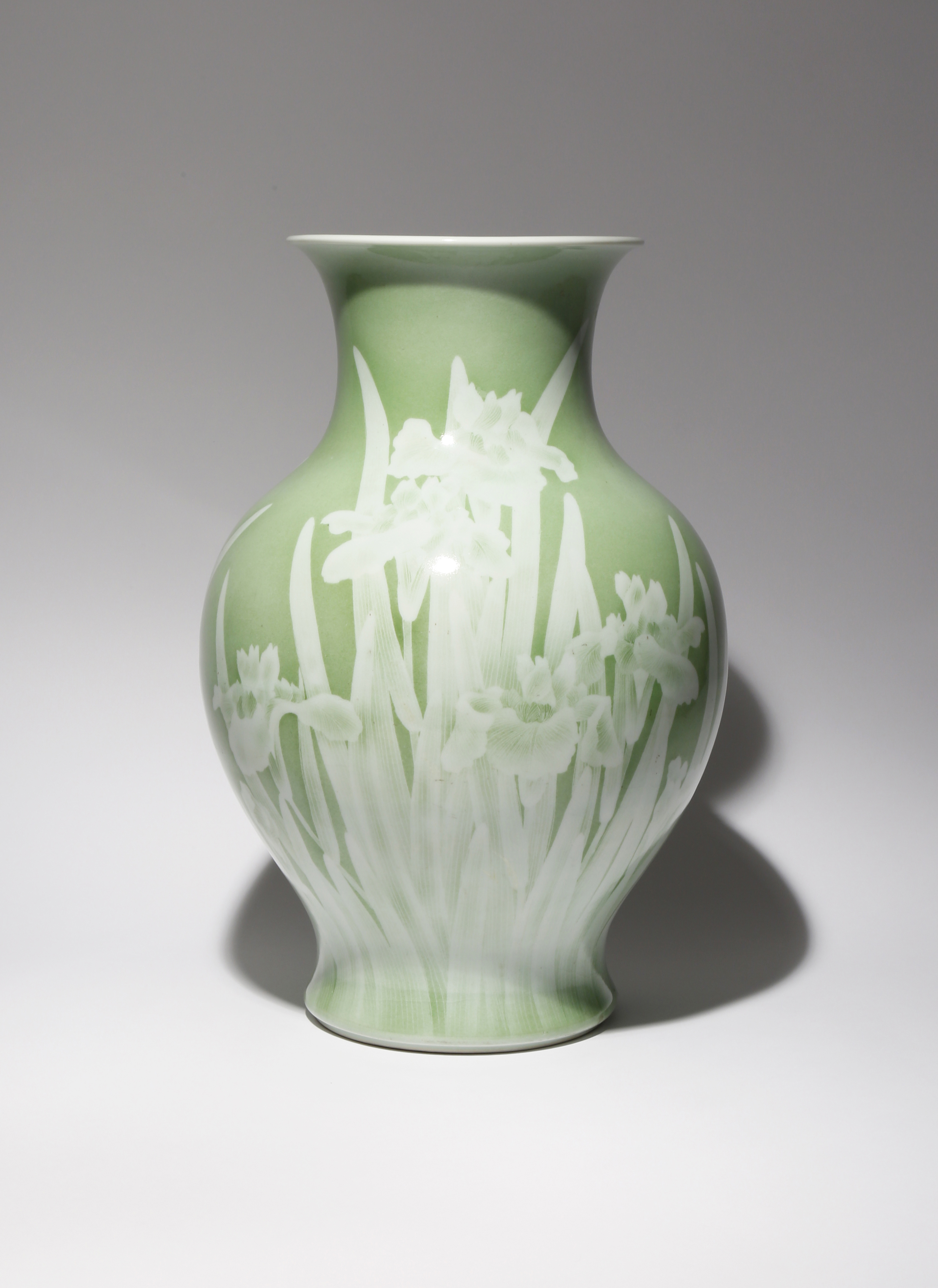 The tall baluster body painted in resist decoration on a diaphanous green-glazed ground with blossoming irises, the inside of the rim left white, the base signed Makuzu Kozan sei in a rectangular cartouche, 43cm.