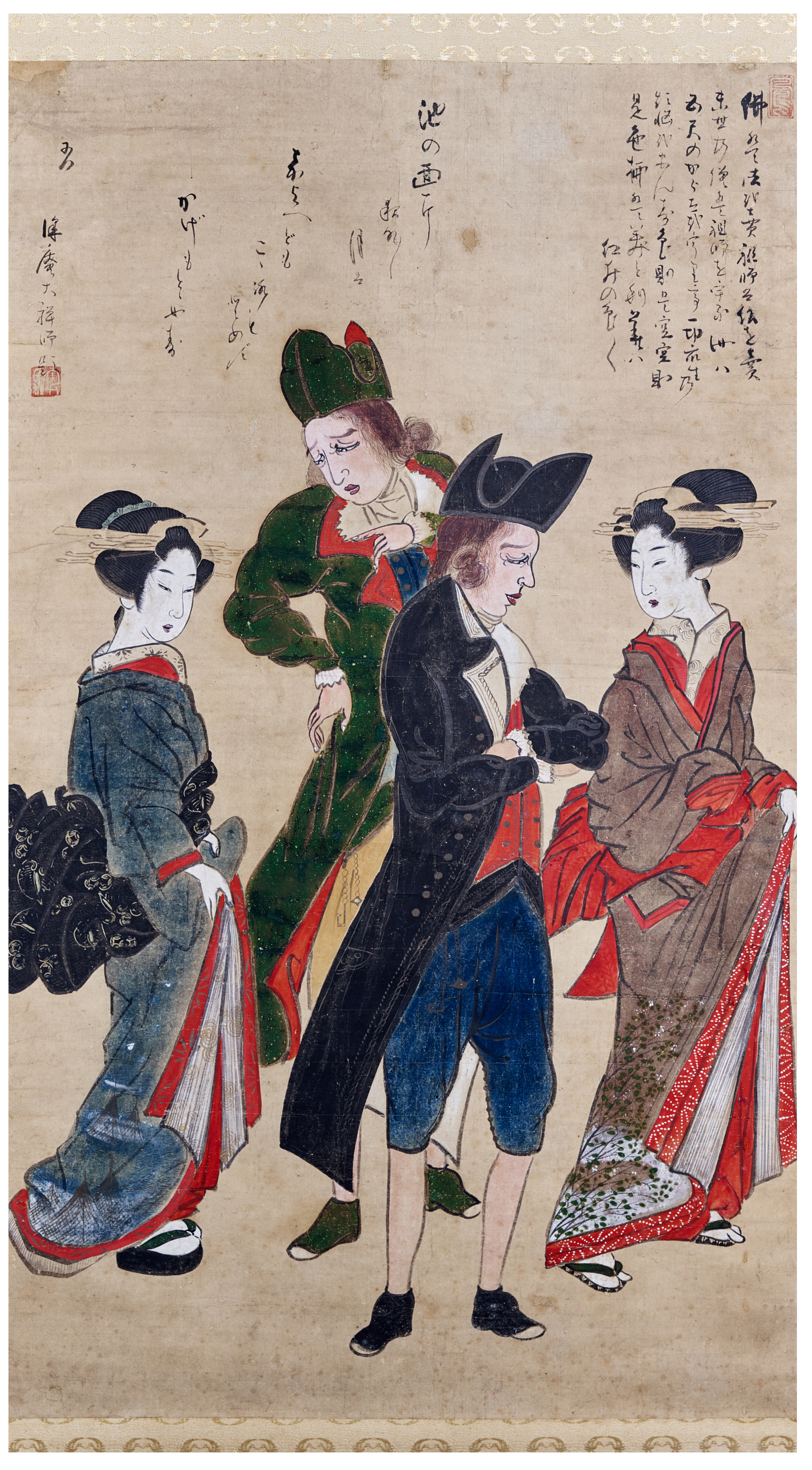 In ink and colour on paper, depicting two Dutch merchants conversing with high-ranking prostitutes, the Westerners wearing long black coats and stylised tricorn hats, the two oiran with elegant kimonos adorned with foliate designs, their elaborate hairstyles featuring multiple ornaments, inscribed above 'Buddha sells doctrine, Patriarchs sell Buddha, Priests of the degenerate ages sell Patriarchs, and Thou sell thy body of five foot, thus satisfying the worldly desires of all creatures' and a poem reading 'the moon frequents nightly the surface of the pond, but does not leave behind its heart nor its shadow', and with two seal marks for Ho and Setuchi, 97cm x 57cm.