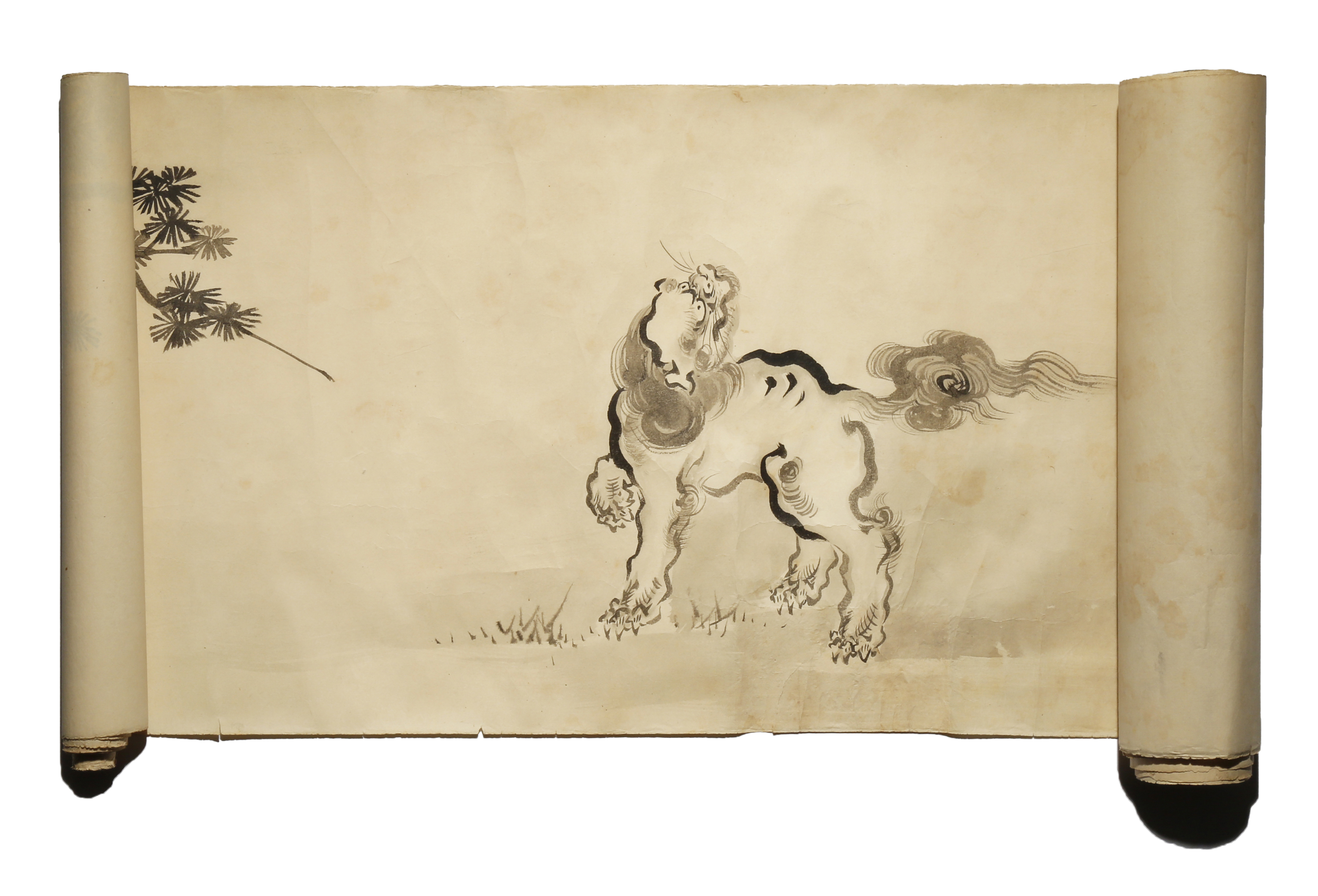 In ink on paper, painted with nine shishi frolicking in a river landscape, the lion dogs depicted with curling manes, the end of the scroll inscribed Hogen Sukekiyo ga for Kano Kuninobu (1787-1840), approx. 28cm x 223cm.