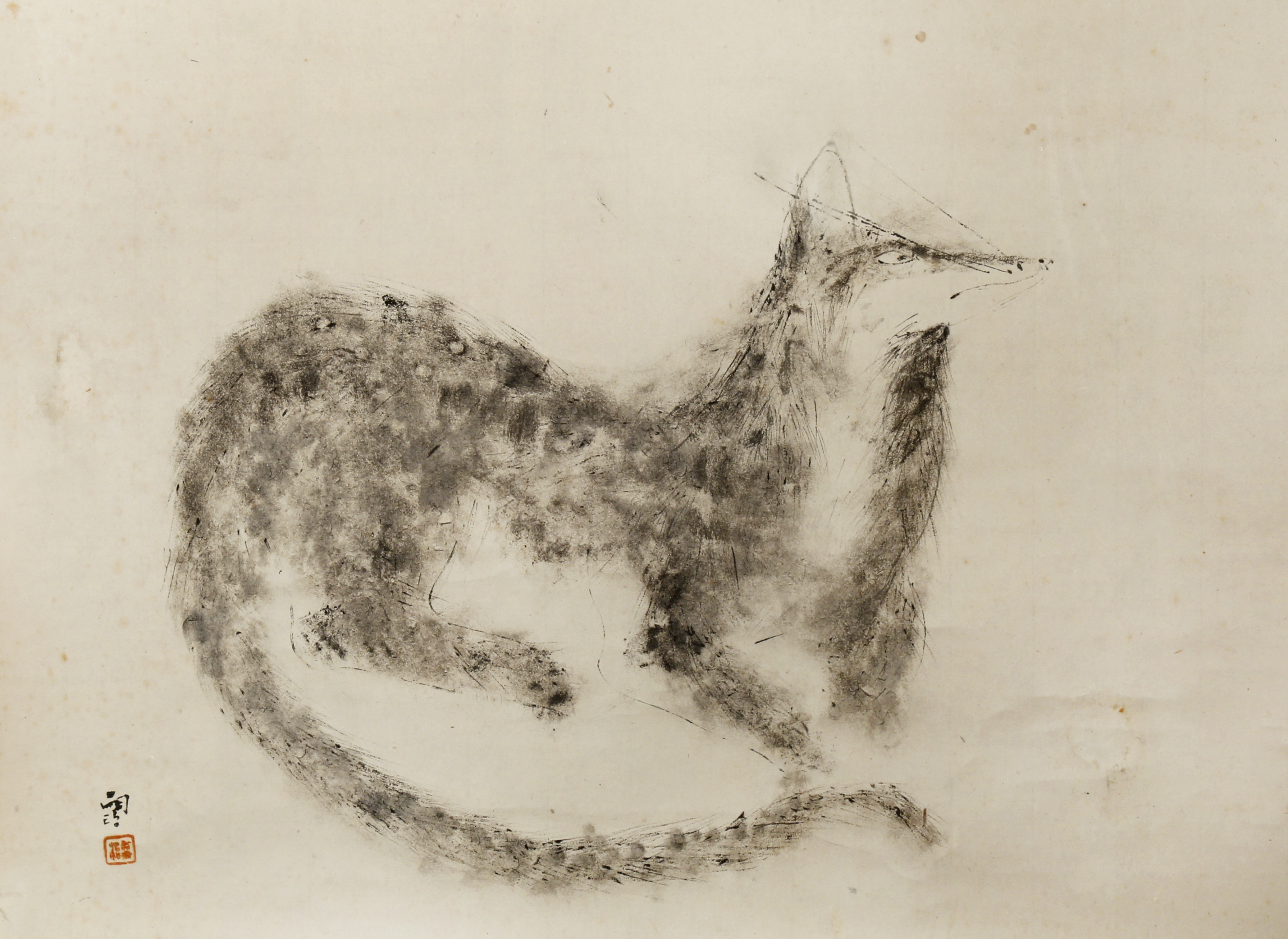 In the style of Leonard Tsuguharu Foujita (1886-1968), in ink on paper and depicting a fox, the canid resting its chin on its paw in a human-like gesture, signed Foujita and with a red seal mark, together with a tomobako box inscribed Kitsune (fox) and with Foujita's name, 38cm x 52cm. (2)