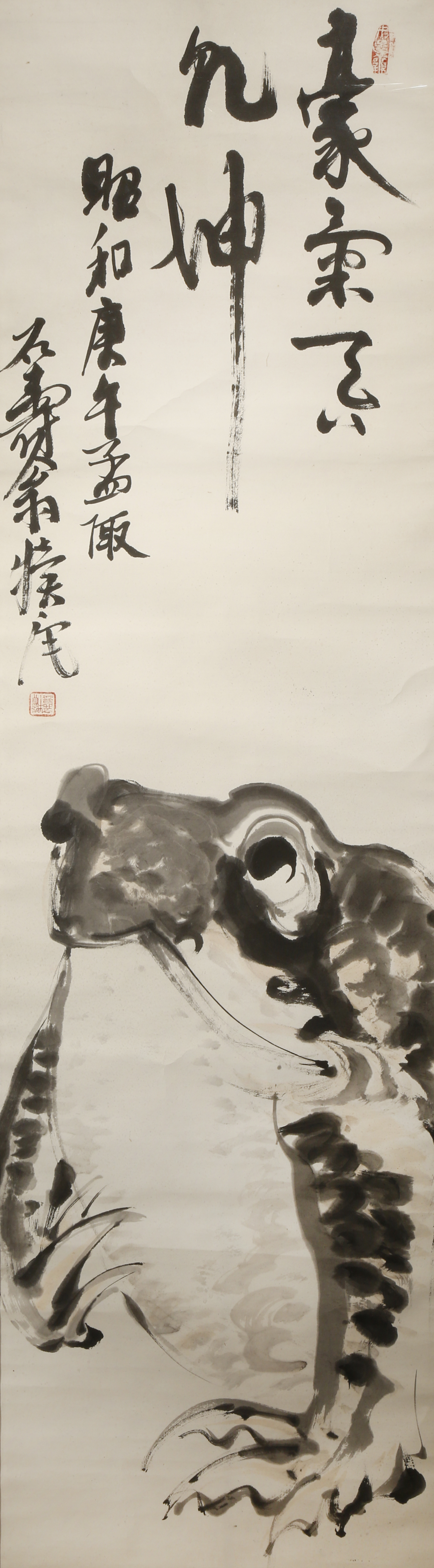 Painted in ink and colour on paper, depicting a large disgruntled-looking toad underneath lines of calligraphy, with two red seal marks, in a modern frame and glazed, 109cm x 31cm.