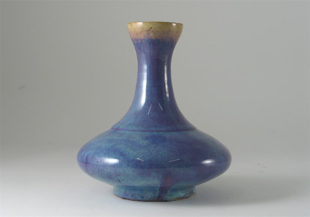A Chinese compressed circular vase with tall, flared neck, decorated with a lavender flamb glaze, incised six character mark of Guangxu and of the period 1896-1908, 18.5cm.
