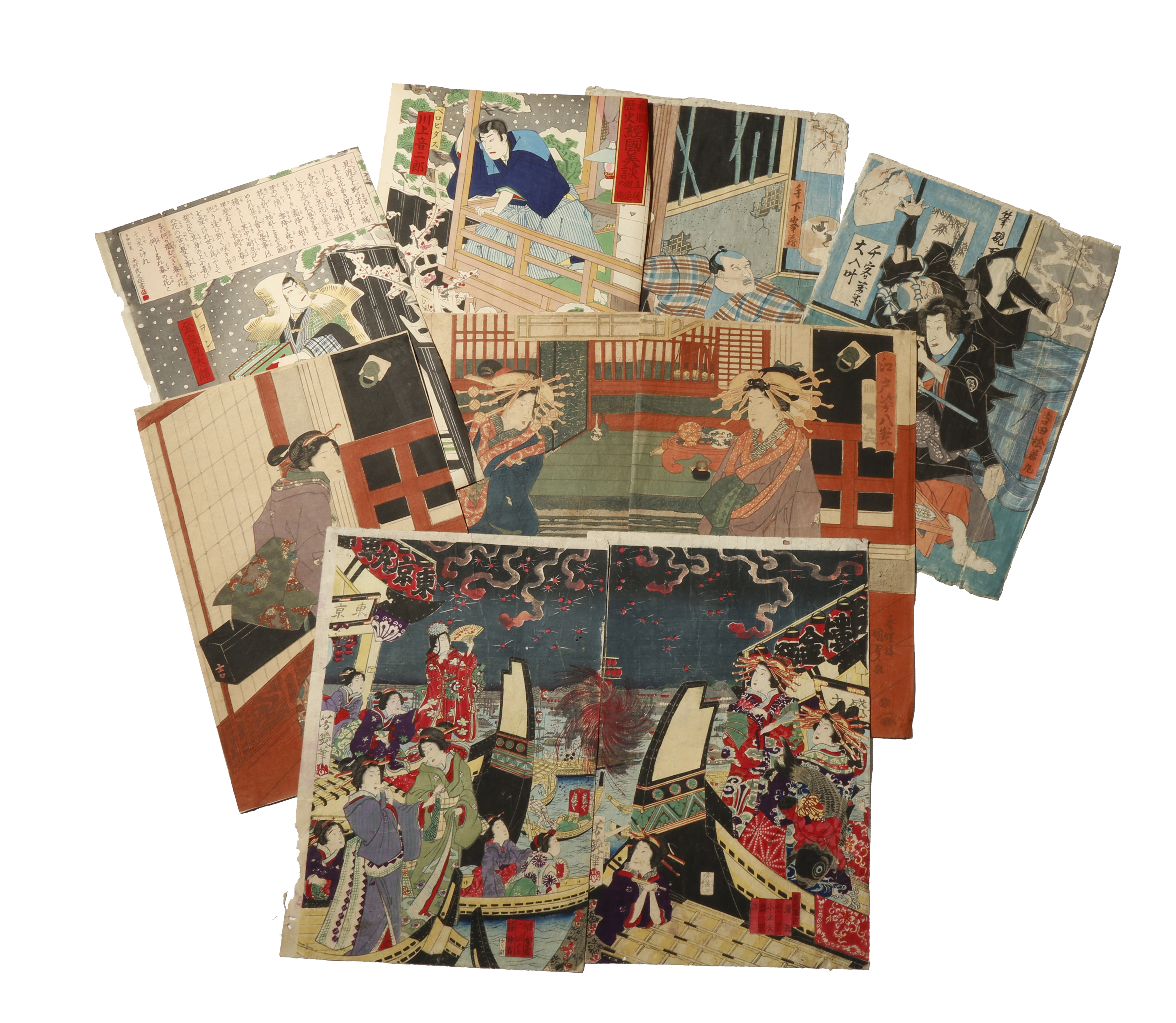 Including a triptych with three beauties in an interior and a diptych of men carousing by Utagawa Kunisada I (1786-1864); a diptych by Yoshiiku Utagawa (1833-1904) with beauties on pleasure boats gazing at fireworks, and a diptych by Utagawa Kunisada III (1848-1920) of two men in a snowy setting, all oban tate-e. (9)
