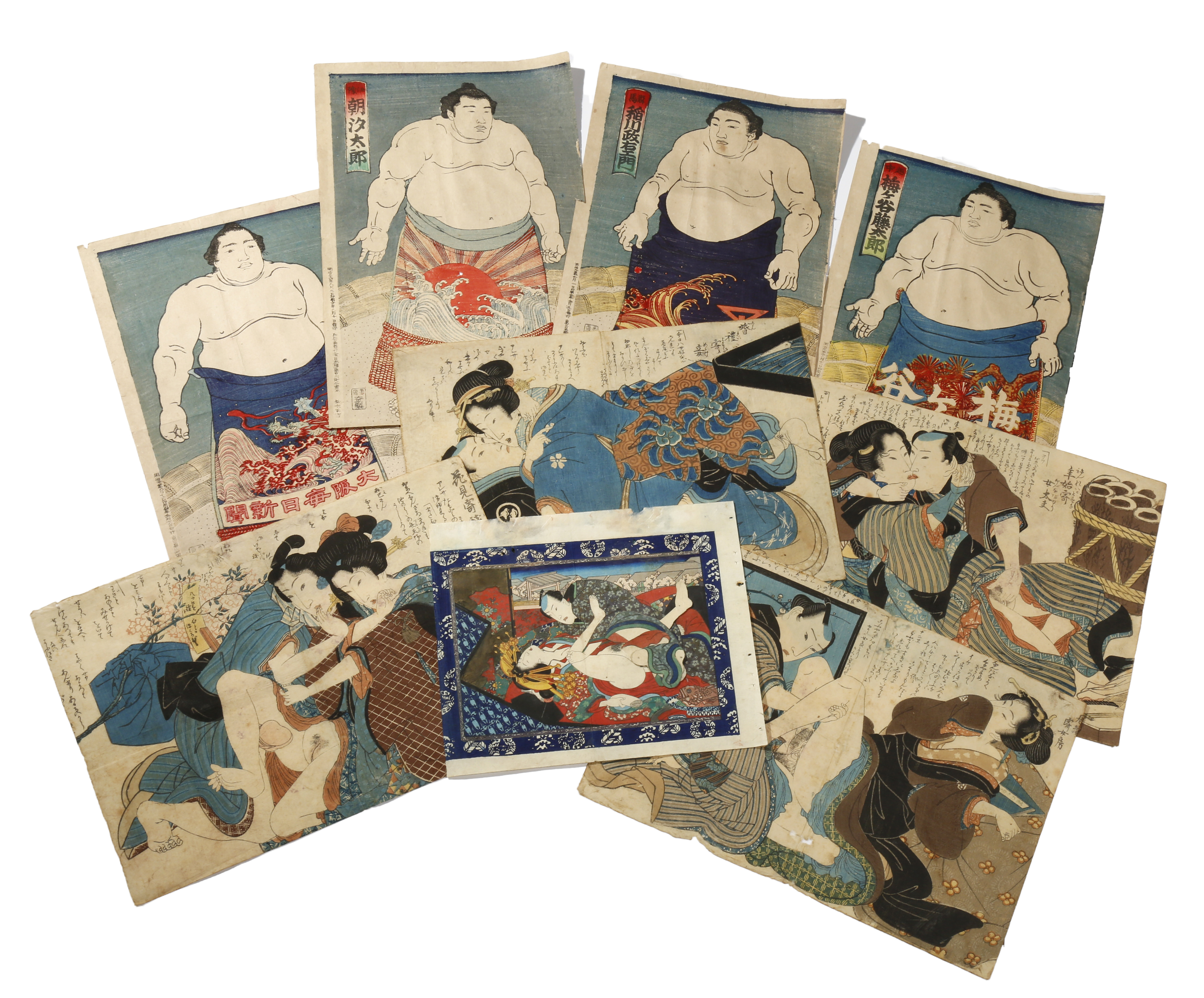 Including eight oban tate-e and one chuban, five prints depicting shunga scenes of couples engaged in daily activities and four portraits of famous sumo wrestlers. (9)