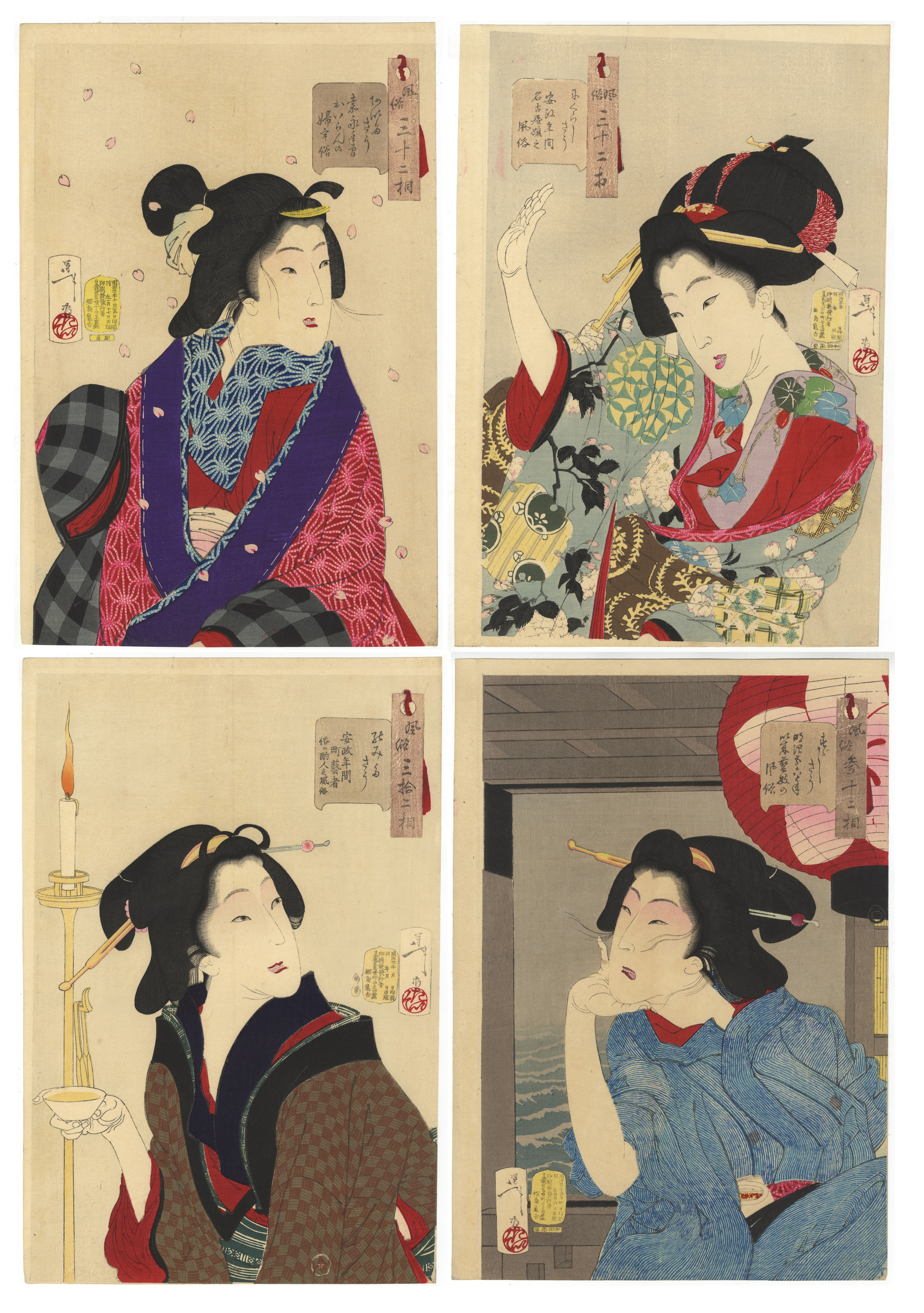 The four oban tate-e from the series Fuzoku sanjuni so (Thirty-two Aspects of Customs and Manners of Women), comprising: a high-ranking prostitute observing cherry blossoms, entitled 'Eager: Habits of an oiran of the Kaei era'; another a beauty holding a wine cup, entitled 'Thirsty: Habits of a street geisha of the Ansei era'; the third waving into the distance and entitled 'Disagreeable: Habits of a young woman of Nagoya in the Ansei era'; the last depicting a courtesan on a boat gazing at the sea, entitled 'Cool: Habits of a geisha of the 5th or 6th year of the Meiji era', each print approx. 24cm x 36cm. (4)