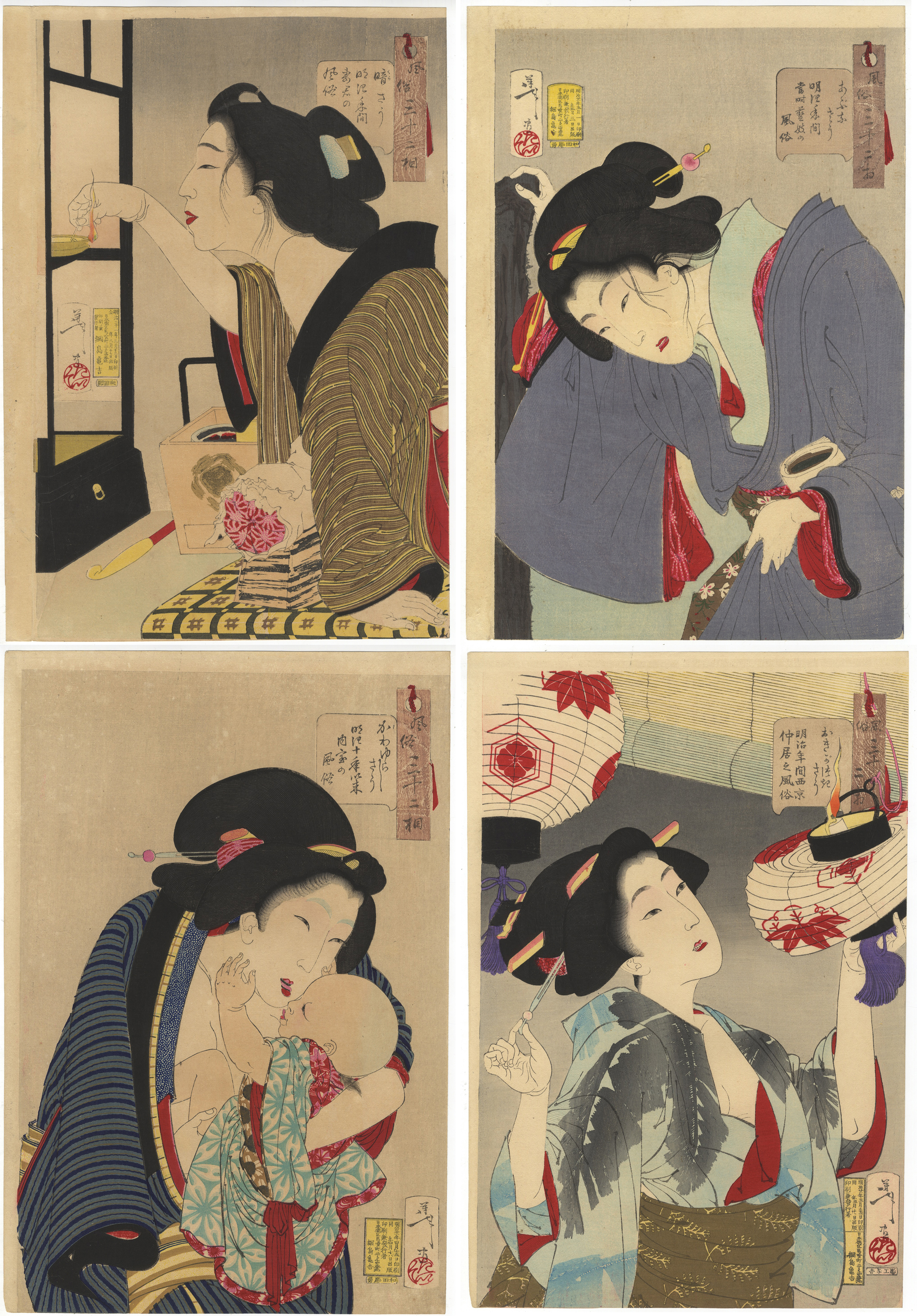 The four oban tate-e from the series Fuzoku sanjuni so (Thirty-two Aspects of Customs and Manners of Women), comprising: a beauty examining a paper lantern, entitled 'Observant: Habits of a waitress of Western Kyoto'; another a mother embracing her toddler; entitled 'Cute: Habits of a housewife of the 10th year of the Meiji era'; the third a woman extinguishing a lantern, entitled 'Dark: Habits of a housewife of the Meiji era'; the last depicted boarding a boat, entitled 'Dangerous: Habits of a modern geisha of the Meiji era', each print approx. 24cm x 36cm. (4)