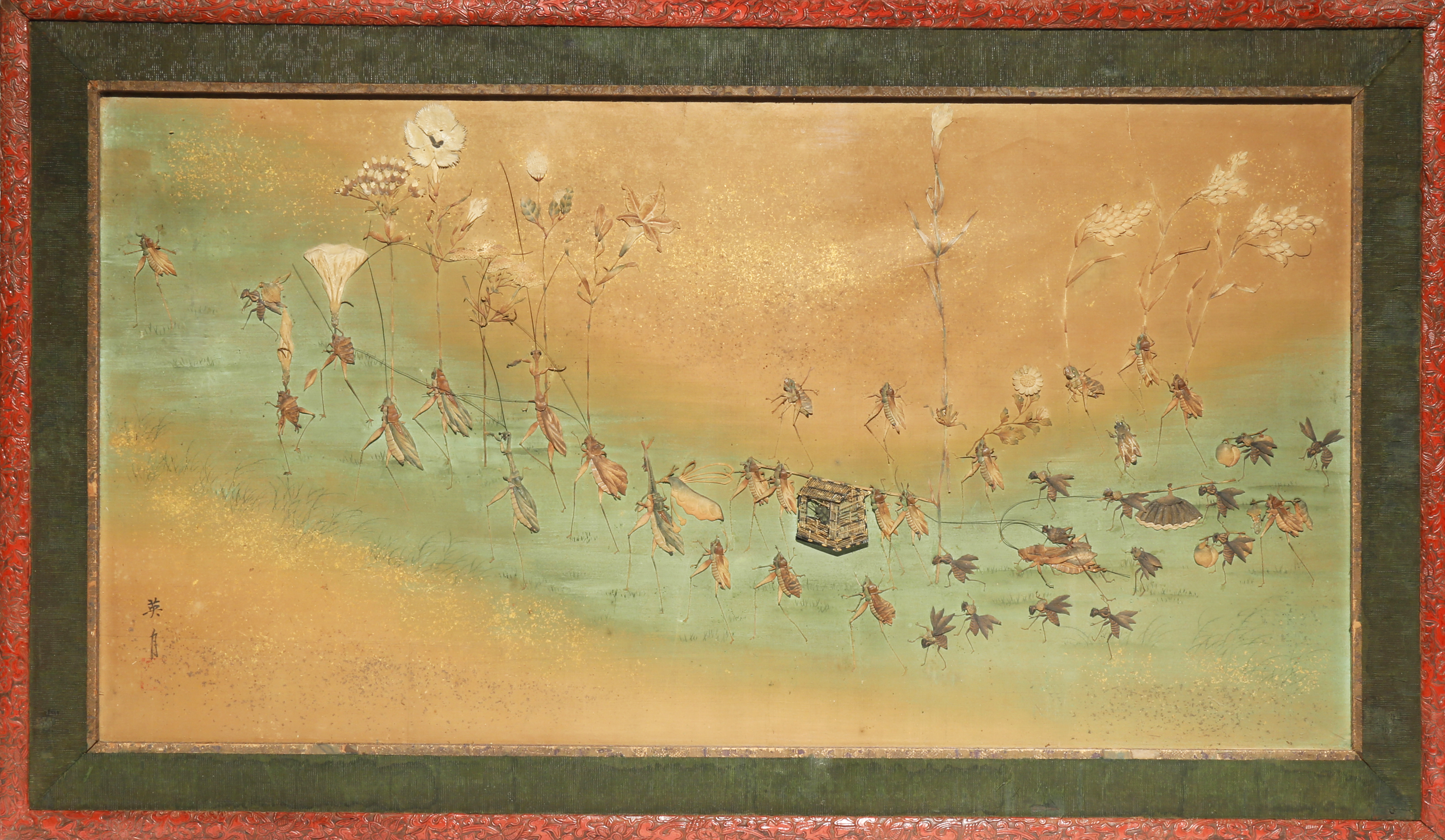 Depicting a procession of forty insects including grasshoppers, praying mantises, ants and other bugs, in relief and made up of paper and folded fabric on a painted ground sprinkled with gold, the insects recreating a daimyo procession when feudal lords and attendants would travel throughout Japan, the noblemen and their retinue alternately living in their domains and in Edo (Tokyo), some carrying large lilies, daisies and other flowers as banners, others with food rations, one locust riding a large cicada as a mount, the beetle daimyo carried in a kago litter by four others, a two character signature to one corner and a red seal mark, in its original frame embellished with green fabric and floral designs in red lacquer, 55cm x 95.5cm.