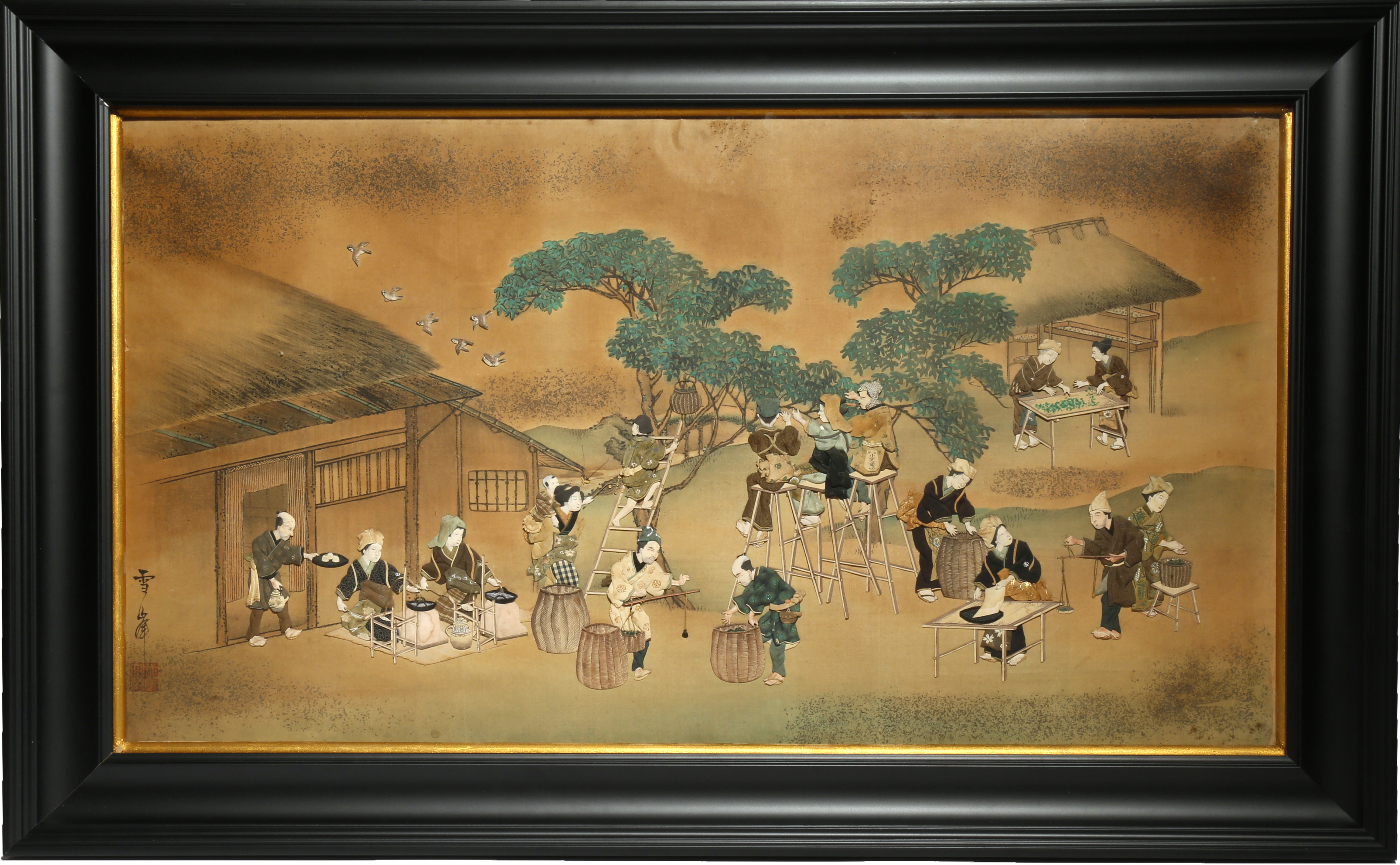 Depicting many figures engaged in sericulture, the different stages of silk production illustrated, with workers picking up silk worms from mulberry trees, others weighing cocoons and two women weaving silk, the design rendered in folded paper and silk on the painted background, signed Sekka to the side and with a red seal mark, framed and glazed, 55cm x 89cm.