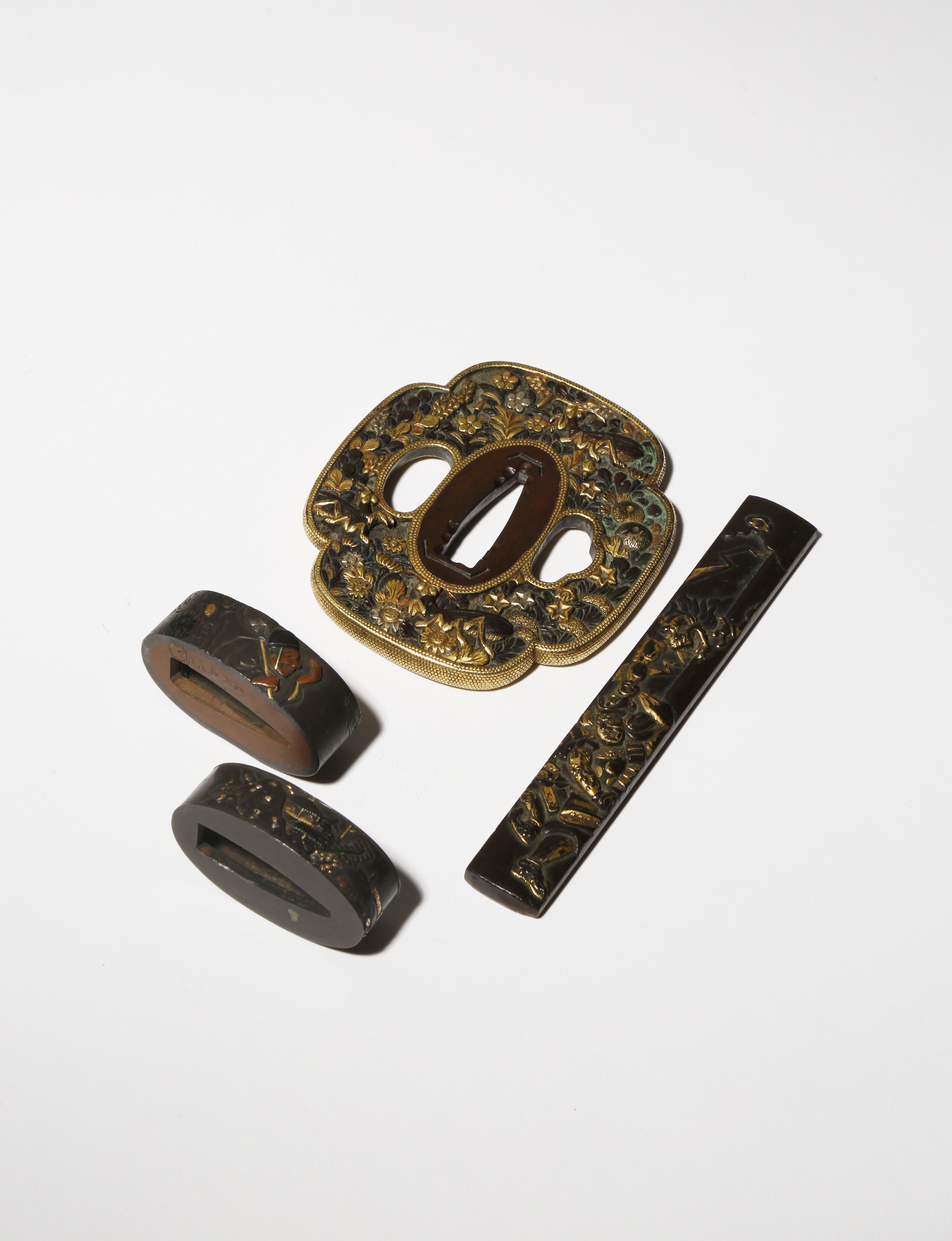 Comprising: a quatrelobed mokko gata tsuba in Mino-Goto style, the hand guard decorated to each side with praying mantis in relief on a dense ground of flowers and foliage; a kozuka handle with an armour-clad samurai and a dragon above, the reverse with mokune decoration; together with two fuchi, one with a continuous design of thatched huts in a mountainous river landscape and the other with a man wearing a Shinto priest's hat, signed Chogaku with kao, 9.6cm max. (4)