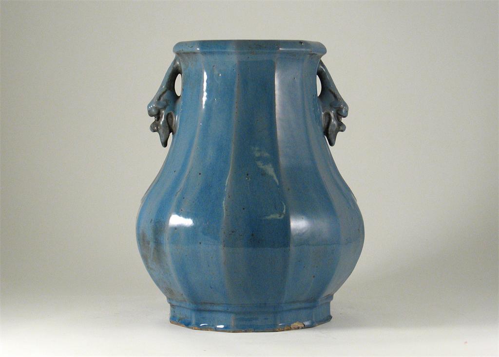 A large lavender glazed hu-shaped vase, with a faceted body and animal mask handles, an impressed four character seal mark, 19th century, 38.5cm.