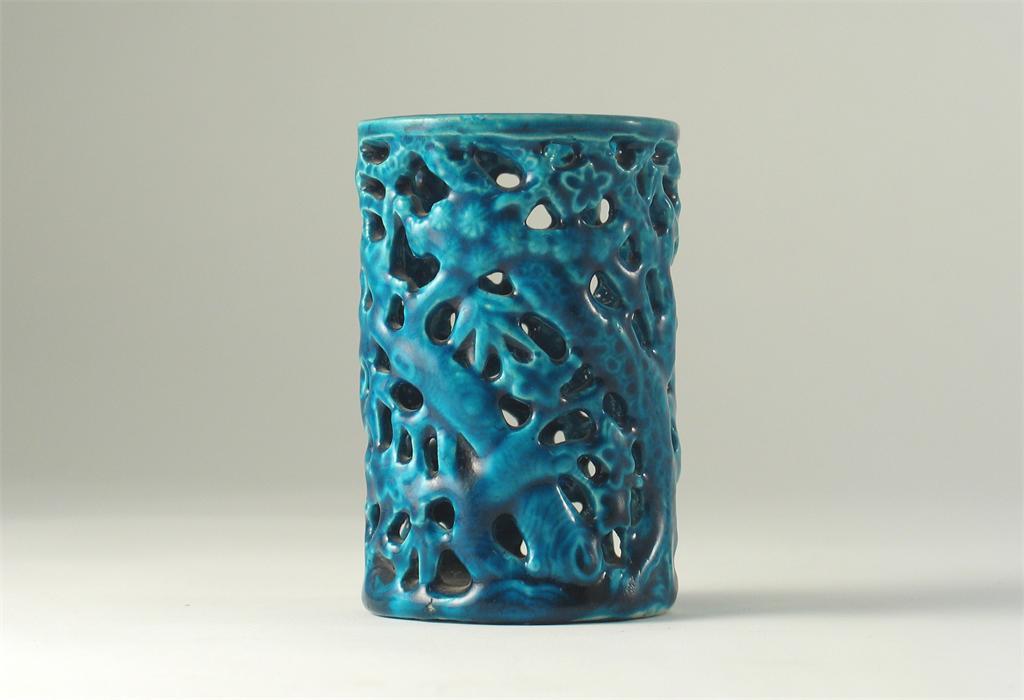 A Chinese turquoise glazed cylindrical brushpot, the body moulded and pierced with branching pine, prunus and bamboo, 18th century, 9.5cm.