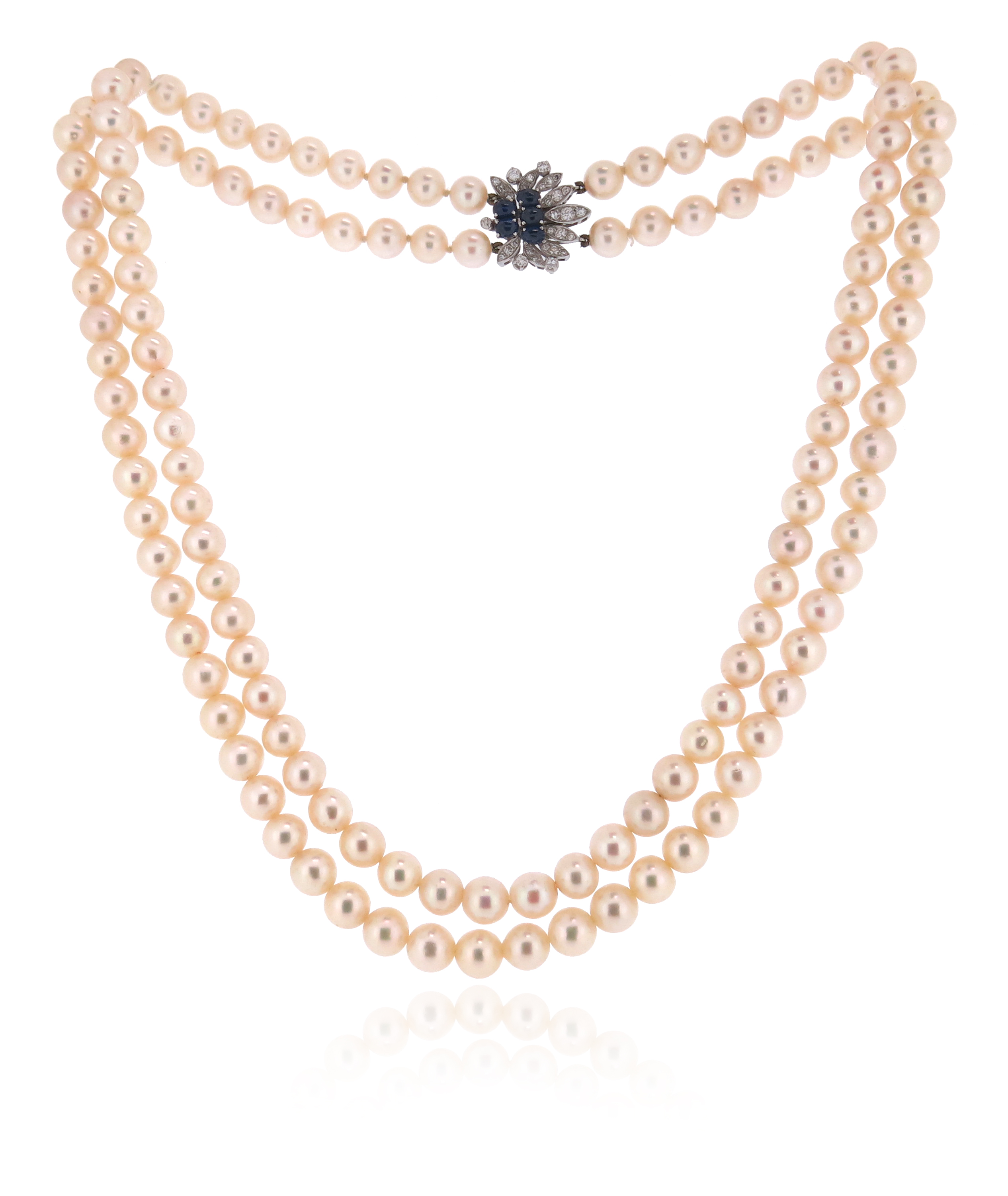 A two-row cultured pearl necklace, the cultured pearls measure approximately 7.5mm, the foliate cluster clasp set with cabochon sapphires and circular-cut diamonds, 53cm shortest