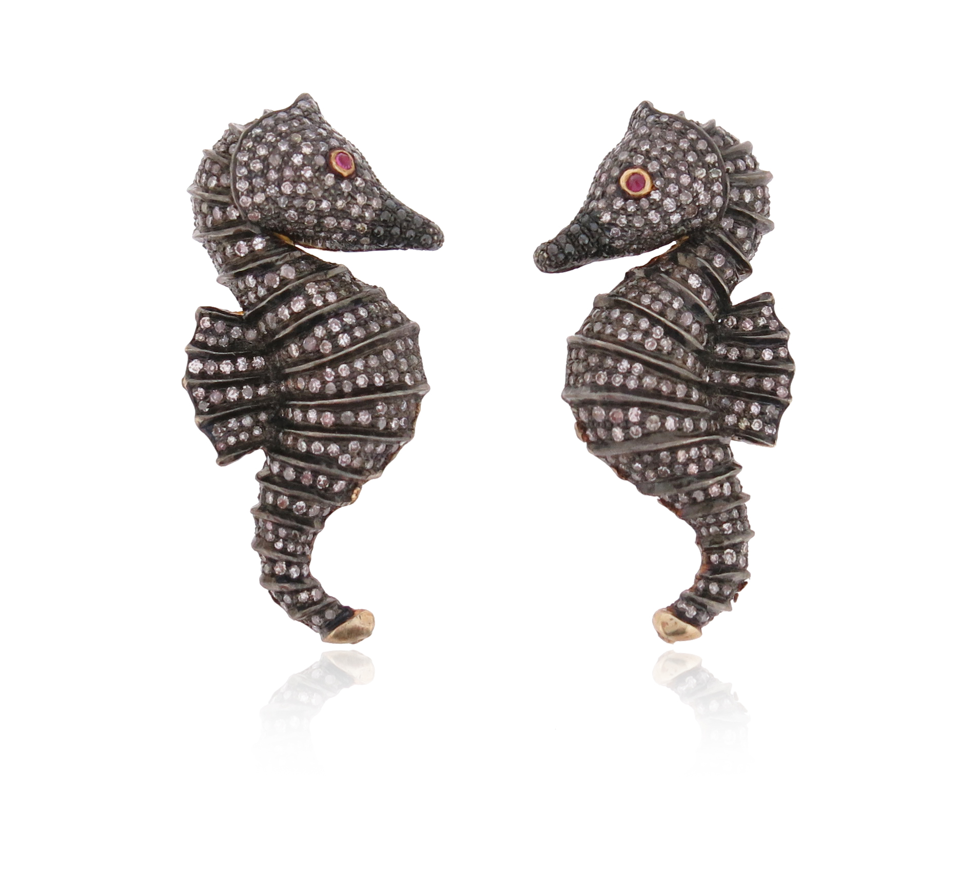 A pair of diamond-set seahorse earrings, pavè-set with single-cut diamonds and a pink-stone eye in silver and gold, 4.8cm high