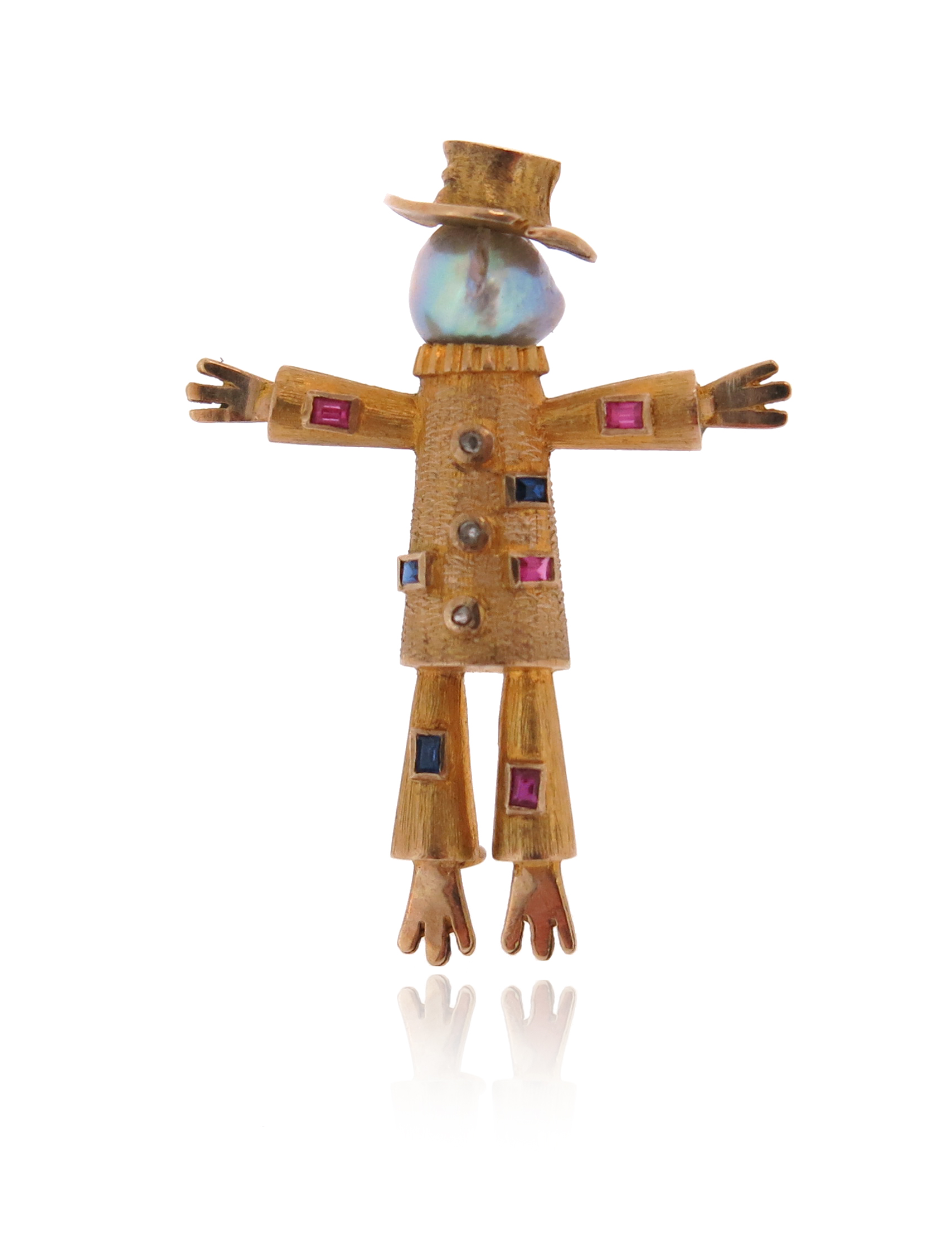 A gem-set gold scarecrow brooch, set with rose-cut diamonds, calibre-cut synthetic rubies and sapphires, the head formed with a cultured pearl in textured yellow gold, signed EVB, 9ct London hallmarks (possibly for 1957, obscured), 4.7cm high, 7g