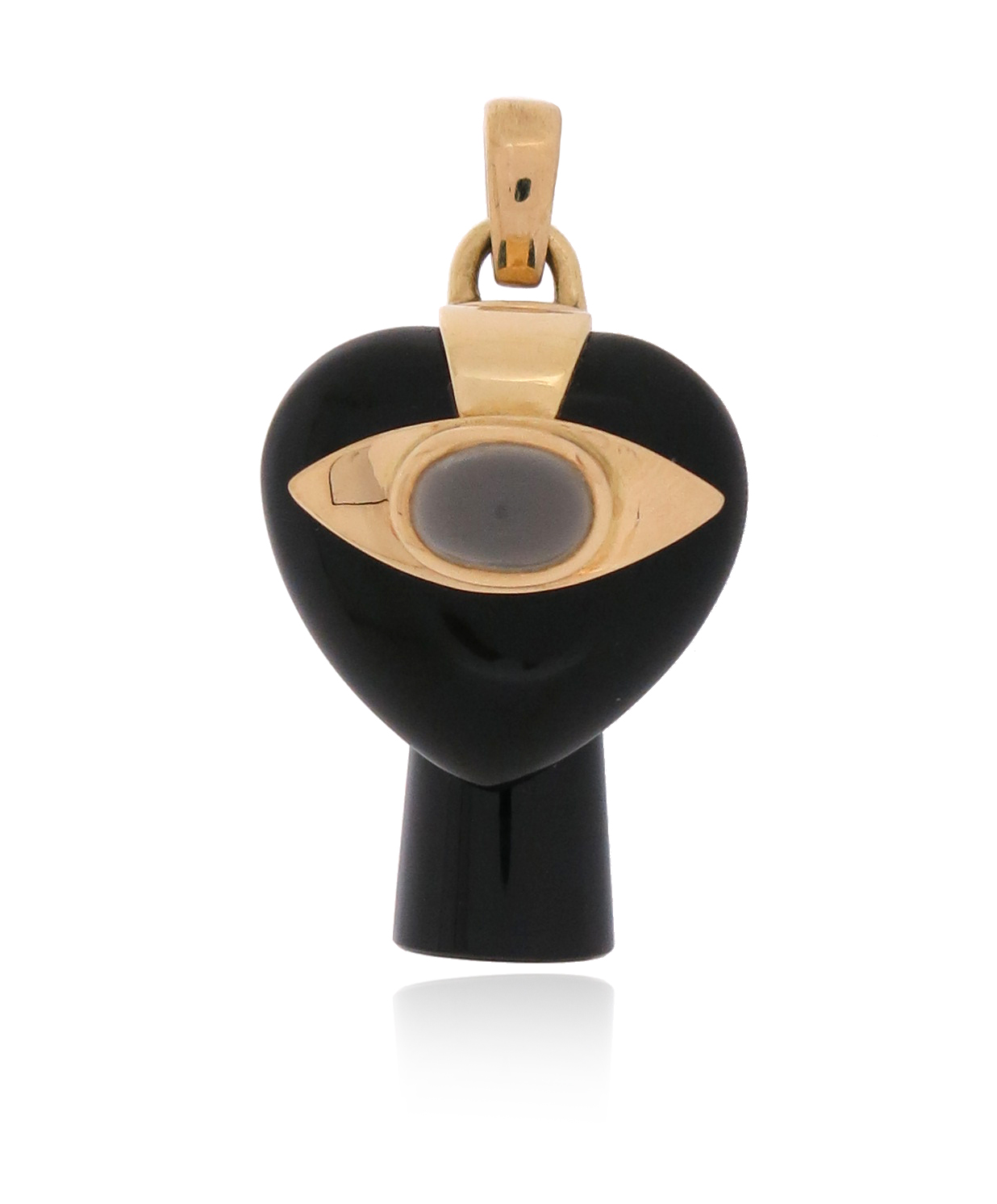 An abstract onyx-mounted gold pendant believed to be by Giorgio Facchini, the onyx heart and baton mounted in gold with a chalcedony cabochon, unsigned, 5cm high including bale, 25g