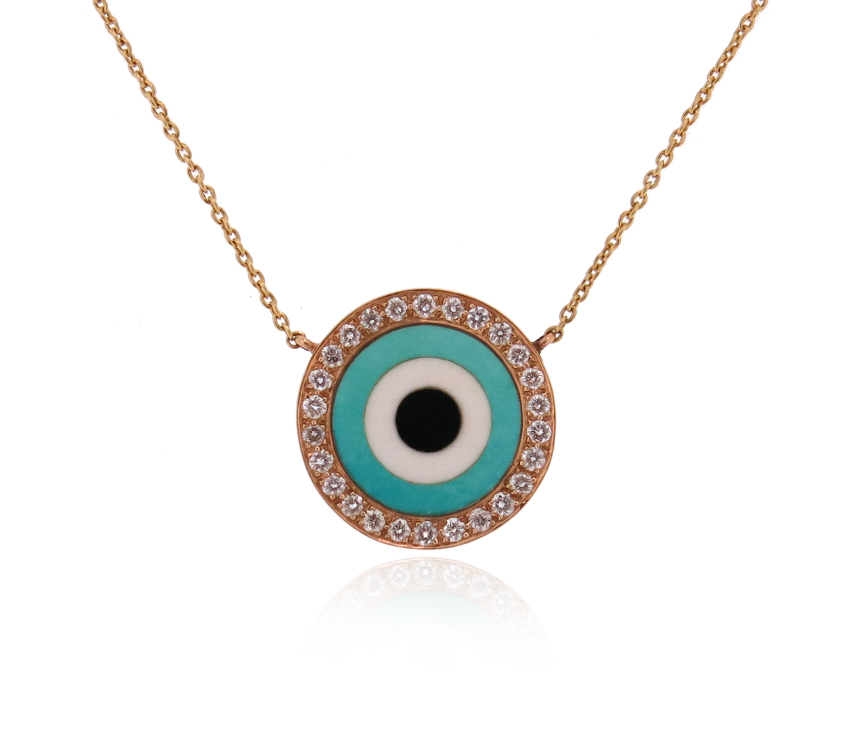 A diamond and hardstone-set 'Evil Eye' pendant, the circular pendant with concentric hardstone inlay within a surround of round brilliant-cut diamonds in gold, on a fine-link gold neck chain, pendant 1.8cm high, chain 22cm long