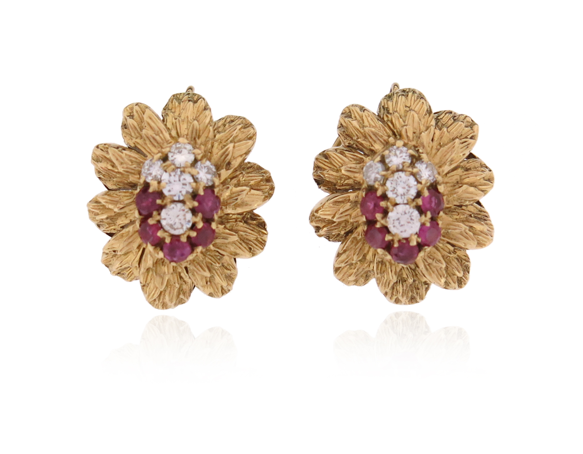 A pair of ruby and diamond clip earrings, of flowerhead design, centred with a cluster of circular-cut rubies and diamonds in textured yellow gold, stamped Italy, French import marks, clip fittings and pendant loops, 2.5cm high