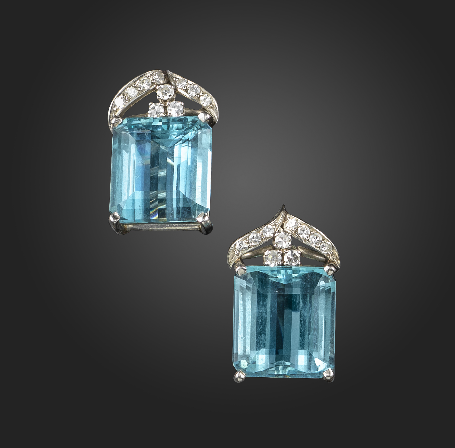A pair of aquamarine and diamond earrings, set with emerald-cut aquamarines below diamond-set foliate upper sections in platinum, aquamarines approximately 20.00cts total, 2.2cm high, case by Garrard
