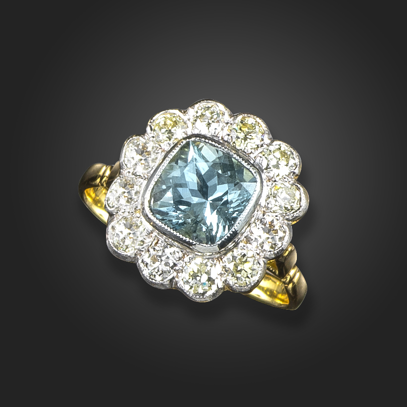 An aquamarine and diamond cluster ring, the square cushion-shaped aquamarine is set within a surround of old circular-cut diamonds in platinum and gold, size N 1/2