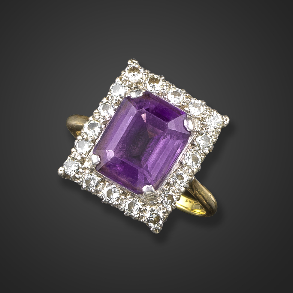 An amethyst and diamond ring, the emerald-cut amethyst set within a surround of round brilliant-cut diamonds in platinum and gold, size T