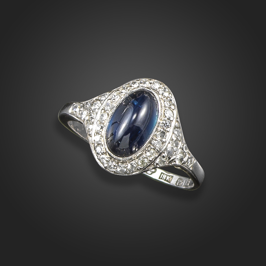 A sapphire and diamond cluster ring, the cabochon sapphire weighs 2.28cts and is set within a surround of old single-cut diamonds in white gold, size Q