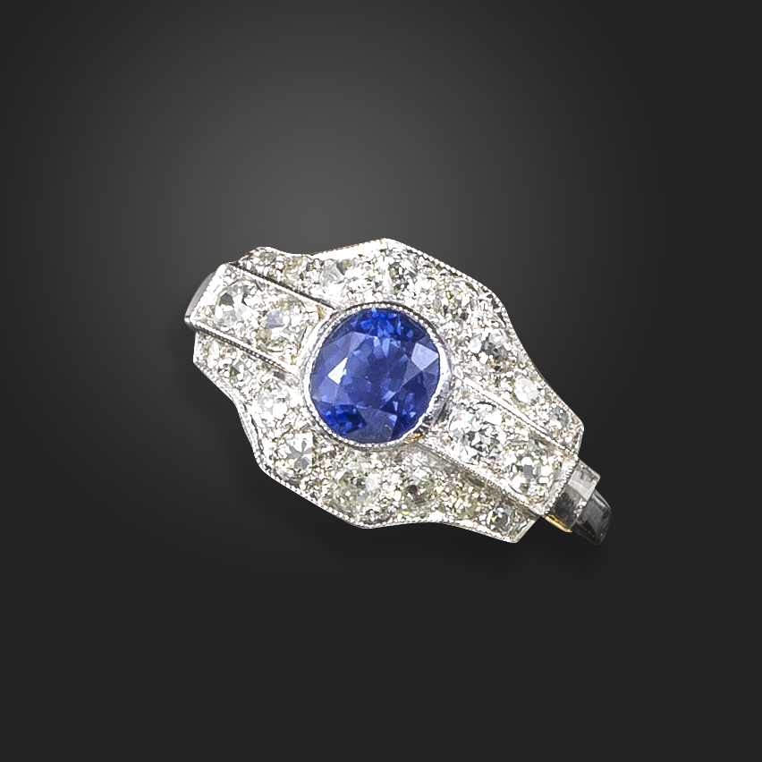 A sapphire and diamond dress ring, set with an oval-shaped sapphire within geometric border pave-set with old circular and single-cut diamonds in white gold, size M ½