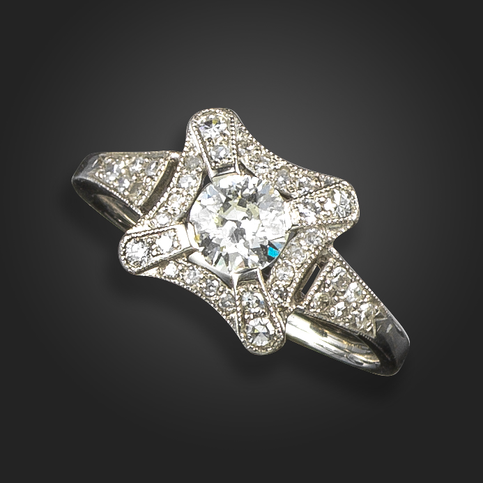 A diamond cluster ring, centred within an old circular-cut diamond weighing approximately 0.50cts, within a square-shaped surround set with old circular-cut diamonds in platinum, size P