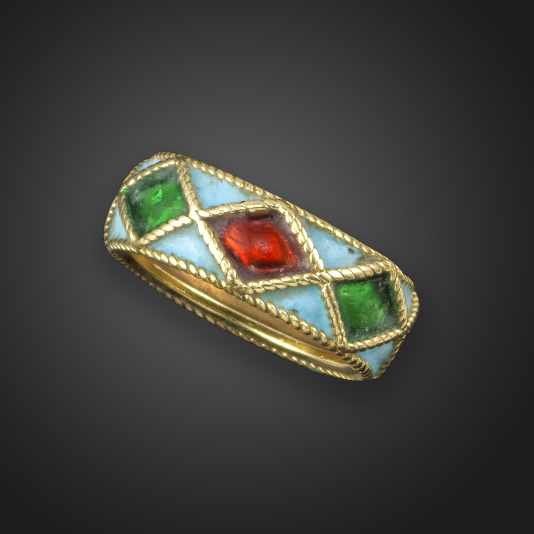 A gold and enamel 'Arlequin' ring by Mauboussin, c.1970, with red, green and blue enamel decoration within ropetwist borders in gold, signed Mauboussin Paris, numbered 224, size O
