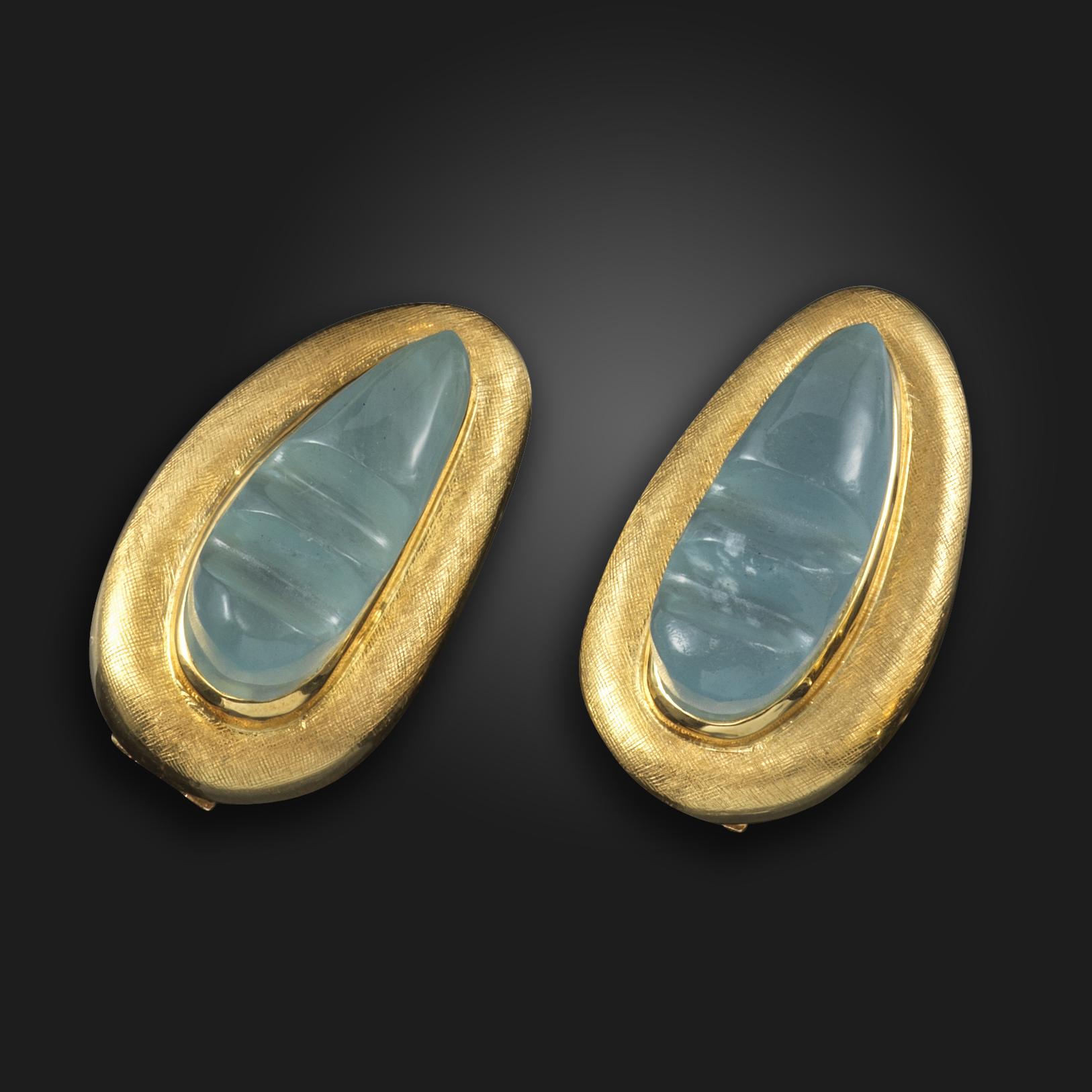 A pair of aquamarine-set gold 'Forma Livre' earrings by Burle Marx, c.1950, set with abstract carved aquamarines in textured gold, signed Burle Marx, clip fittings, 3cm high
