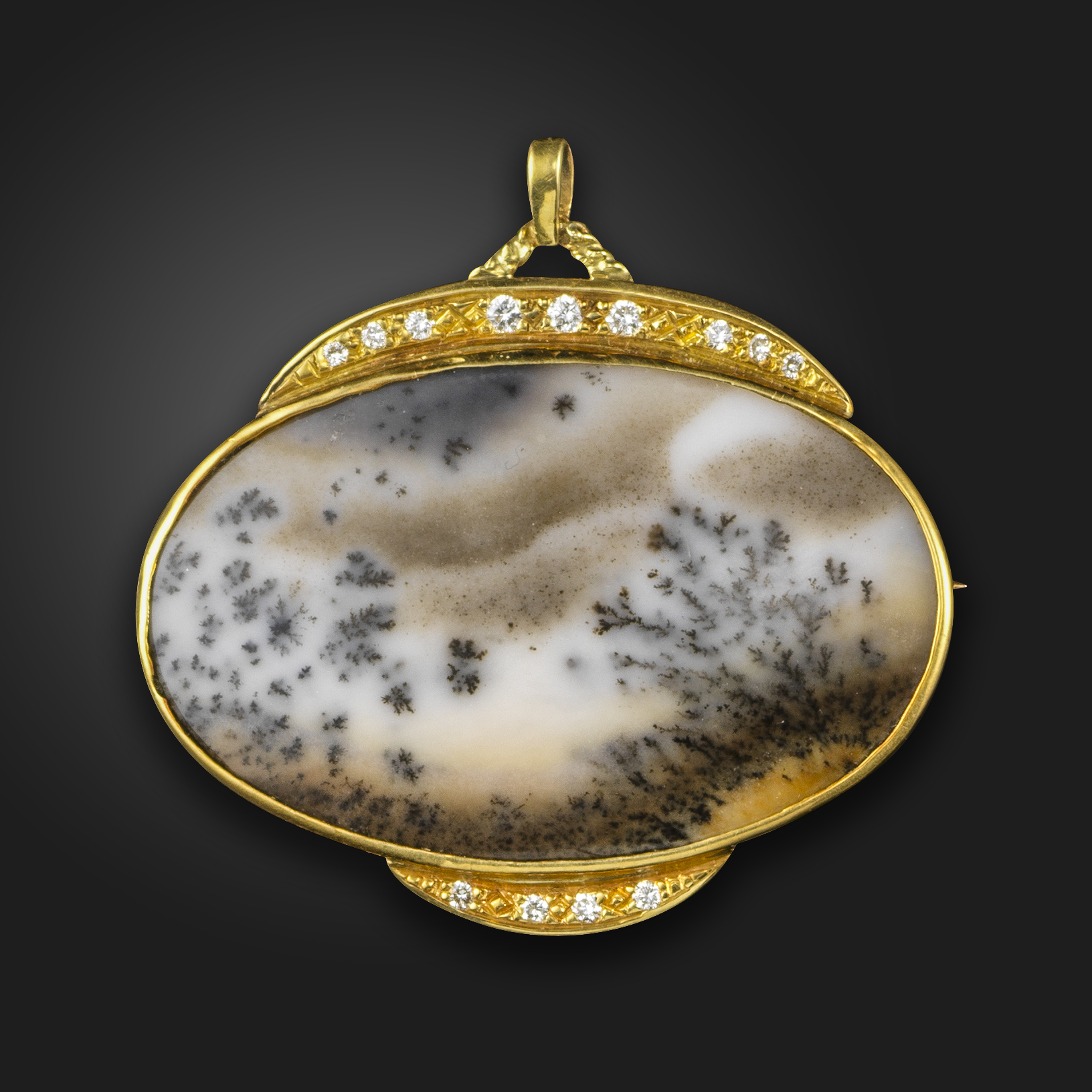 A moss agate and diamond-set gold brooch pendant by Geoffrey Rowlandson
