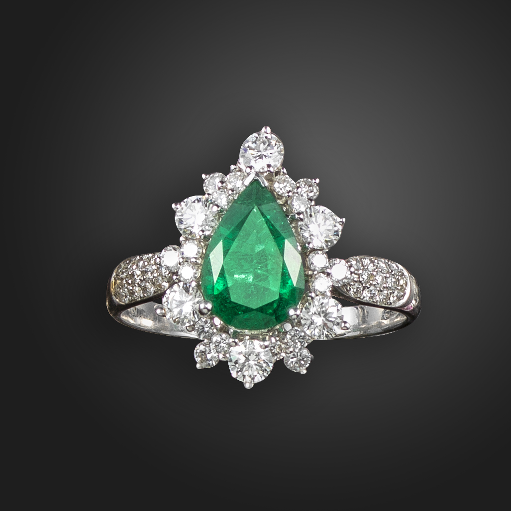 An emerald and diamond cluster ring, set with a pear-shaped emerald within a surround of graduated round brilliant-cut diamonds, with pave-set diamond shoulders in white gold, 18ct London hallmarks, size W 1/2