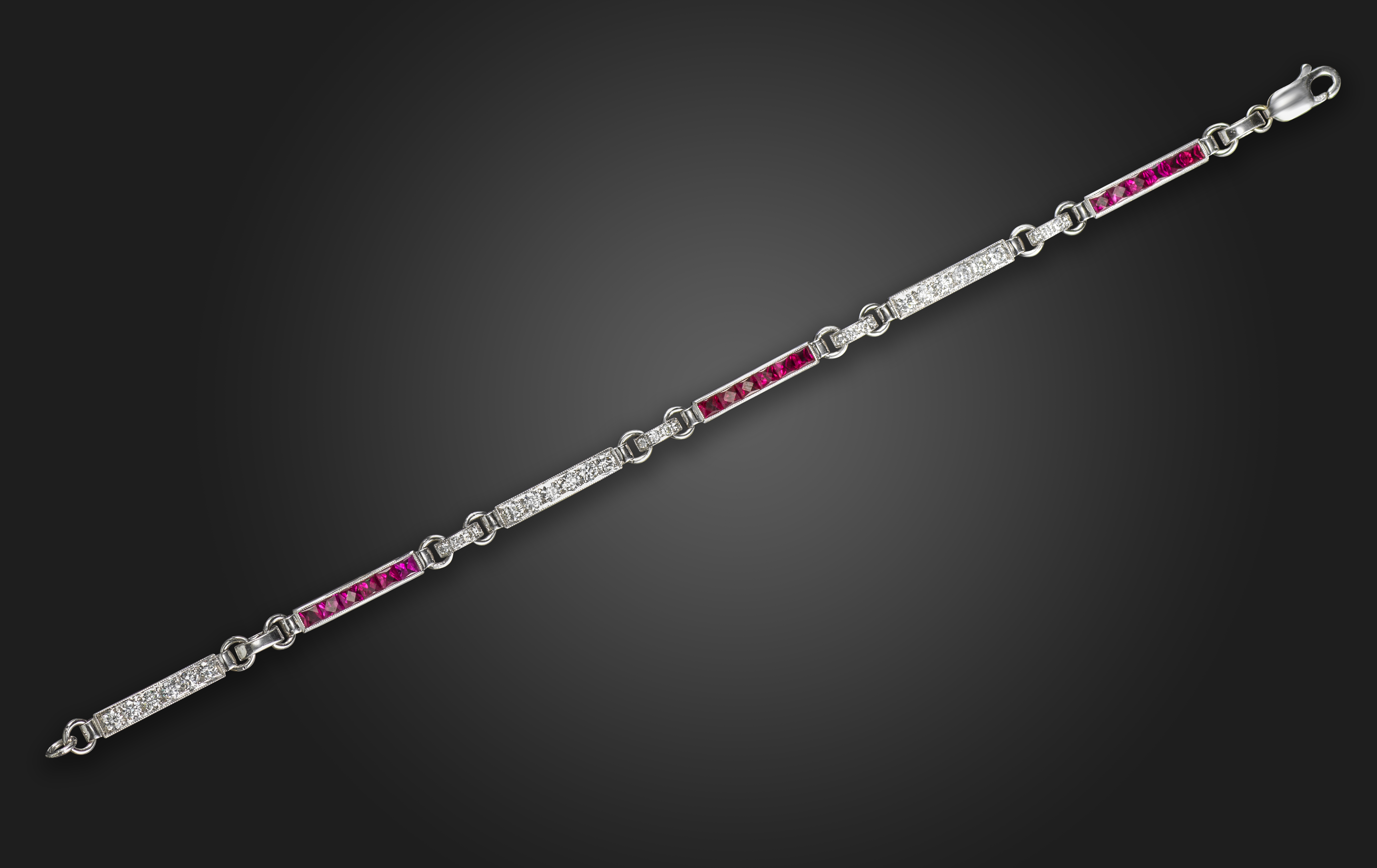 A ruby and diamond bracelet, the bar links set with French-cut rubies and round brilliant-cut diamonds, with diamond-set spacers in white gold, diamonds approximately 1.90cts total, 19cm long