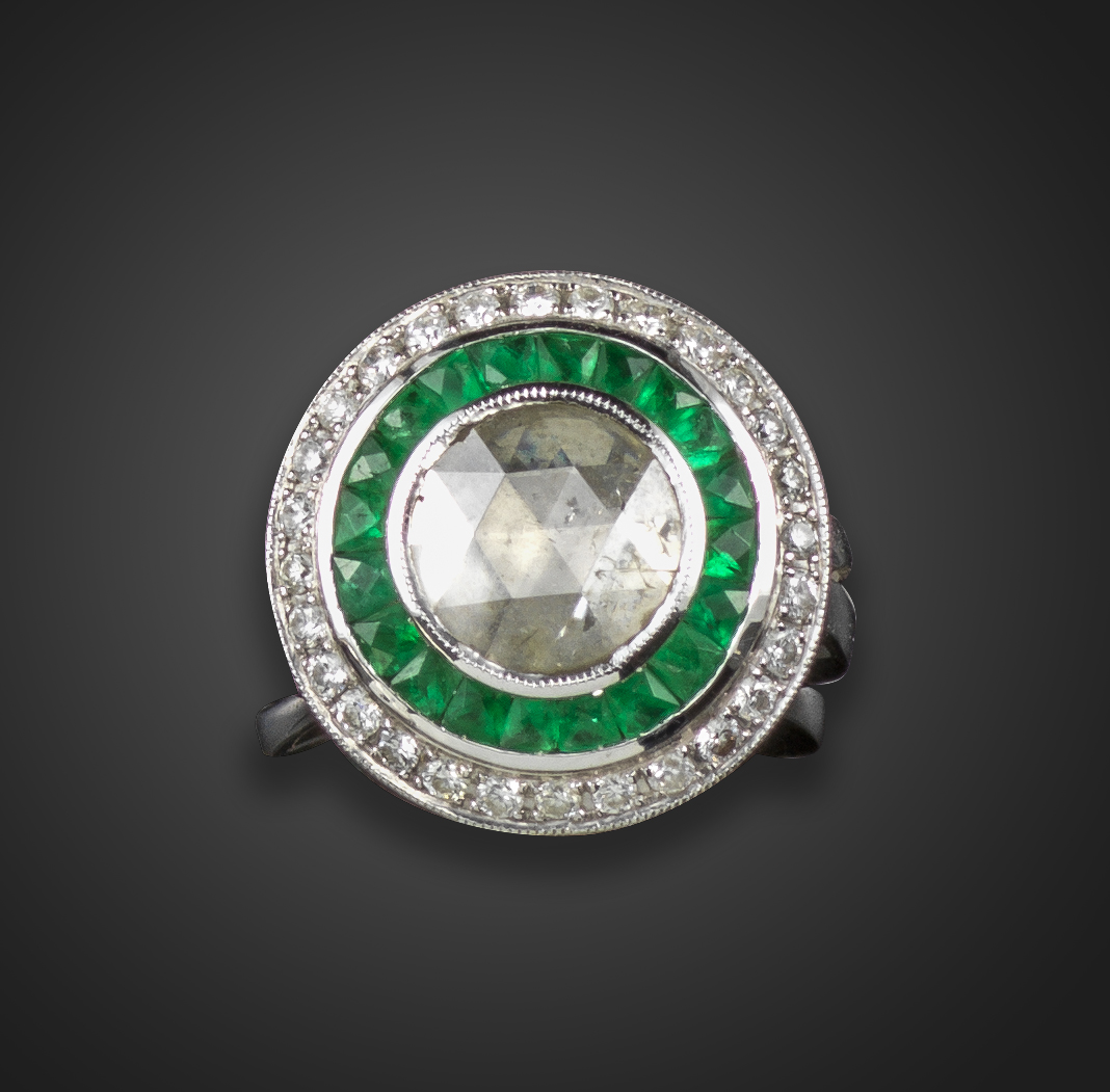 An emerald and diamond target ring, the central rose-cut diamond is set within a surround of French-cut emeralds and round brilliant-cut diamonds in platinum, size N