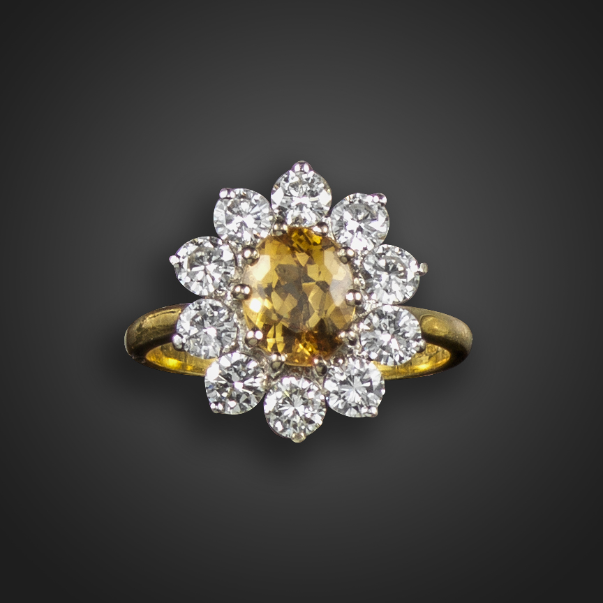 A topaz and diamond cluster ring, the oval-shaped orange topaz set within a surround of round brilliant-cut diamonds in gold, size J