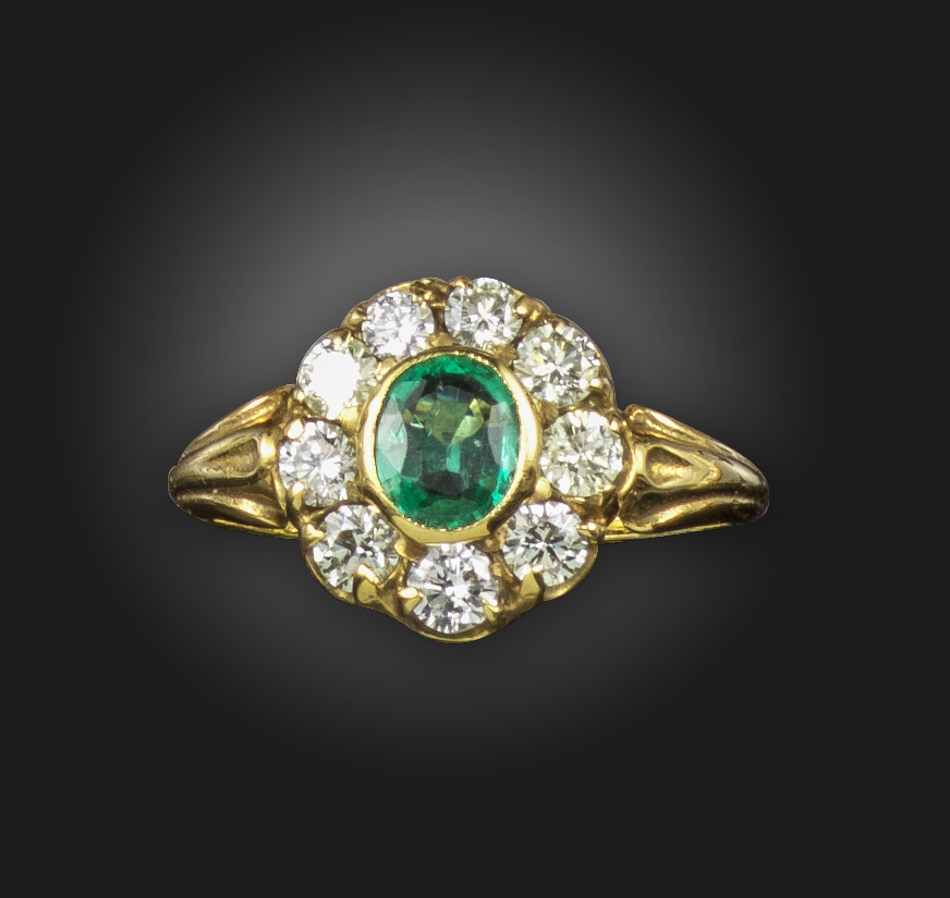 An emerald and diamond cluster ring, the oval-shaped emerald is set within a surround of round brilliant-cut diamonds in gold, emerald approximately 0.85cts, diamonds approximately 0.70cts, size M