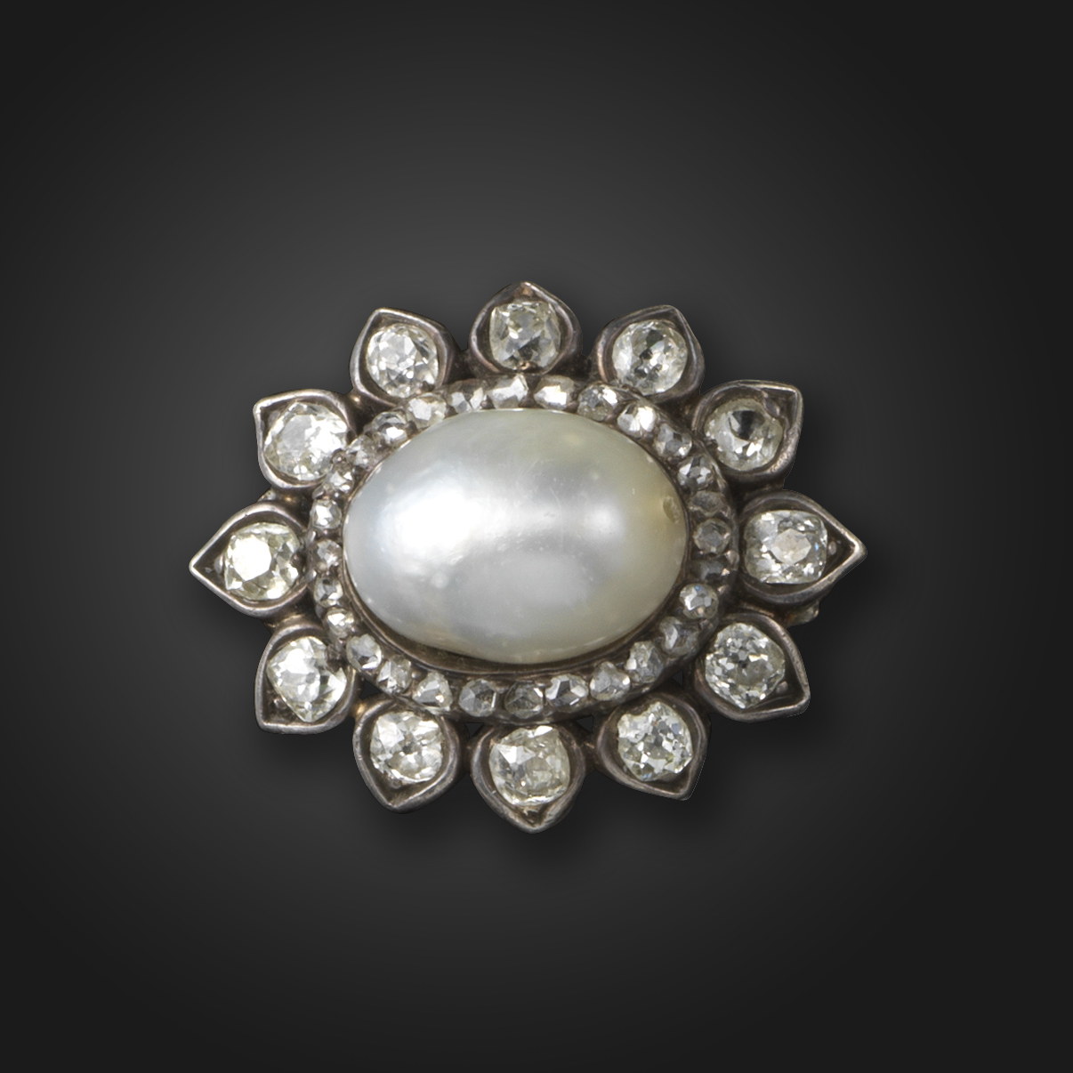 A Victorian natural pearl and diamond brooch, of flowerhead design, the natural pearl set within a surround of rose-cut diamonds, with outer border of old cushion-cut diamond-set petals in silver on gold, 3cm wide