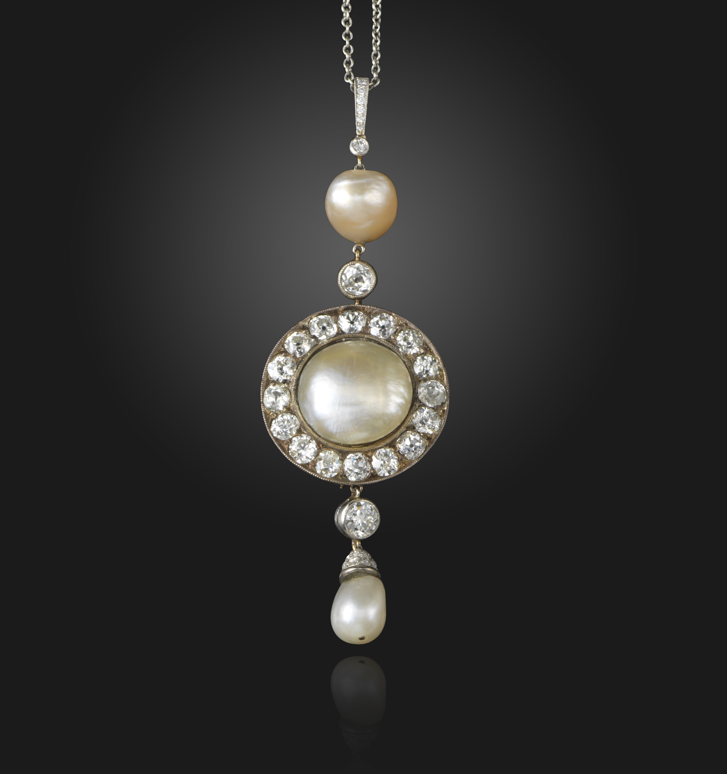A natural pearl and diamond pendant, the circular centre section set with a natural pearl set within a surround of circular-cut diamonds, suspending further diamonds and a natural pearl with a diamond-set cap, diamond-set bale in silver, platinum and white gold, 7.5cm high