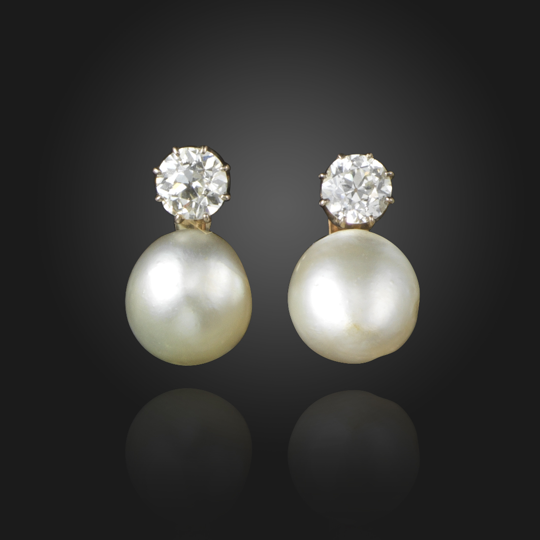 A pair of natural pearl and diamond earrings, the natural pearls suspend from old circular-cut diamonds in gold, post fittings, 1.6cm high