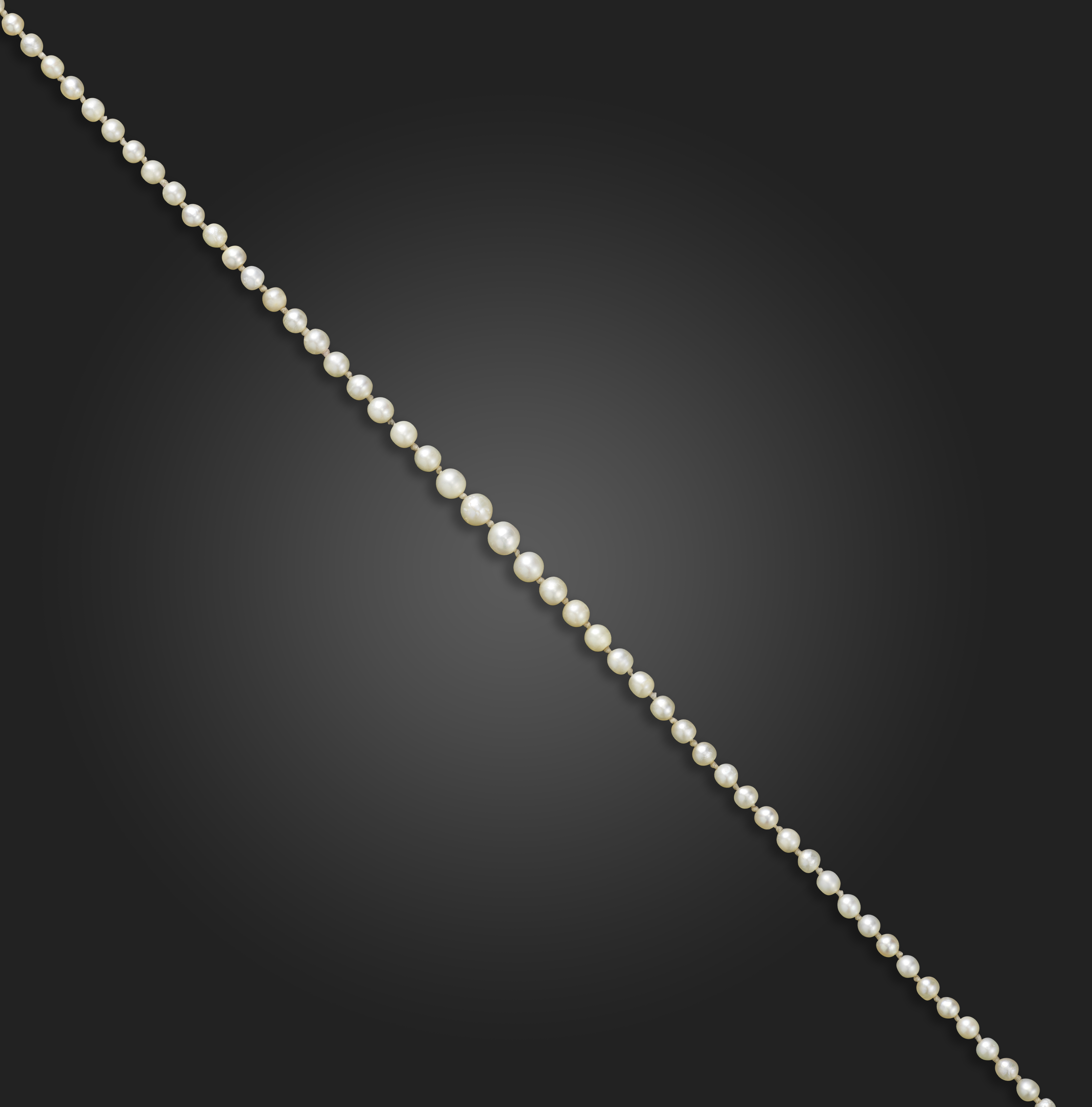 A single-row natural pearl necklace, the pearls graduate from 2.3 - 4.8 mm, with a rose-cut diamond-set barrel clasp, 48cm long
