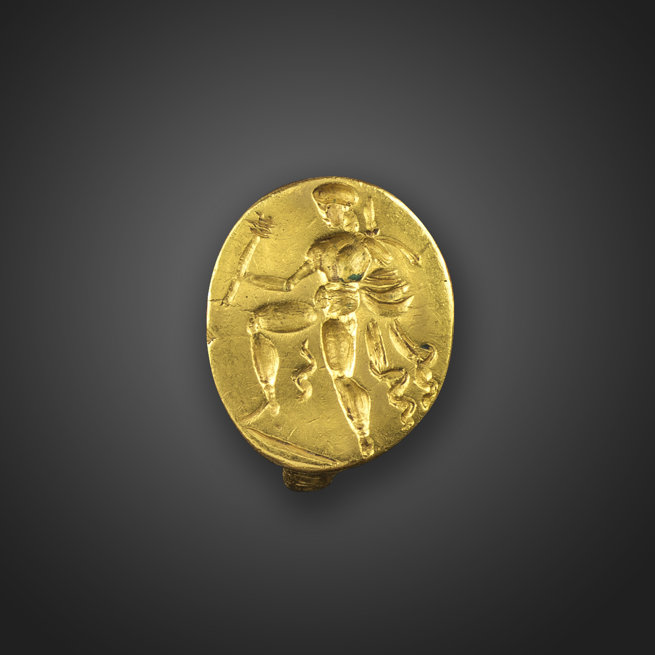 A Greek gold finger ring depicting a warrior, Classical period, c.late 5th century BC, the warrior striding uphill and holding an unlit torch, 2.1cm high, approximately size L