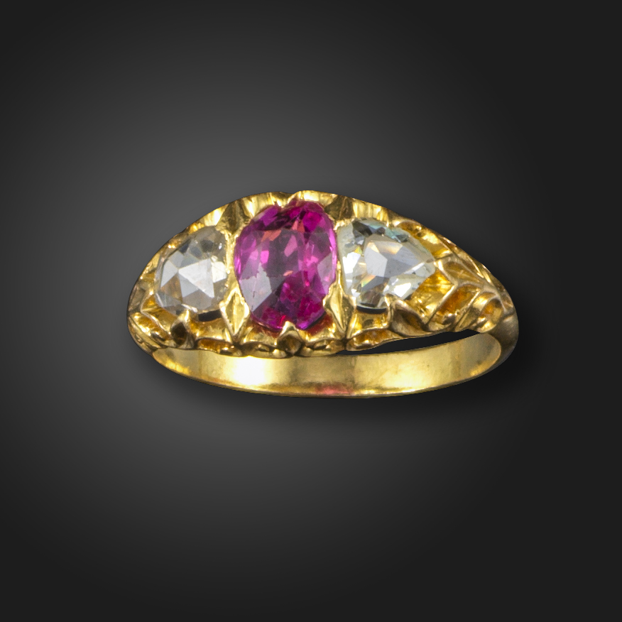 A pink sapphire and diamond three stone ring, the oval-shaped pink sapphire set with rose-cut diamonds in carved and pierced yellow gold mount, size P