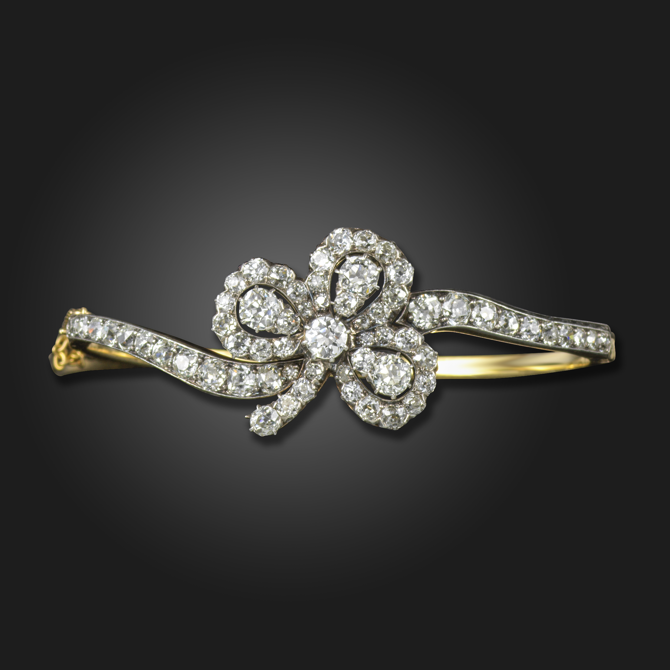A late Victorian diamond-set convertible bangle, the shamrock centre section set with old circular-cut diamonds, with further graduated old circular-cut diamonds to the bangle shoulders in silver on gold, the shamrock detaches to be worn as a pendant, folding pendant loop, pendant 3cm high, bangle 5.8cm internal diameter