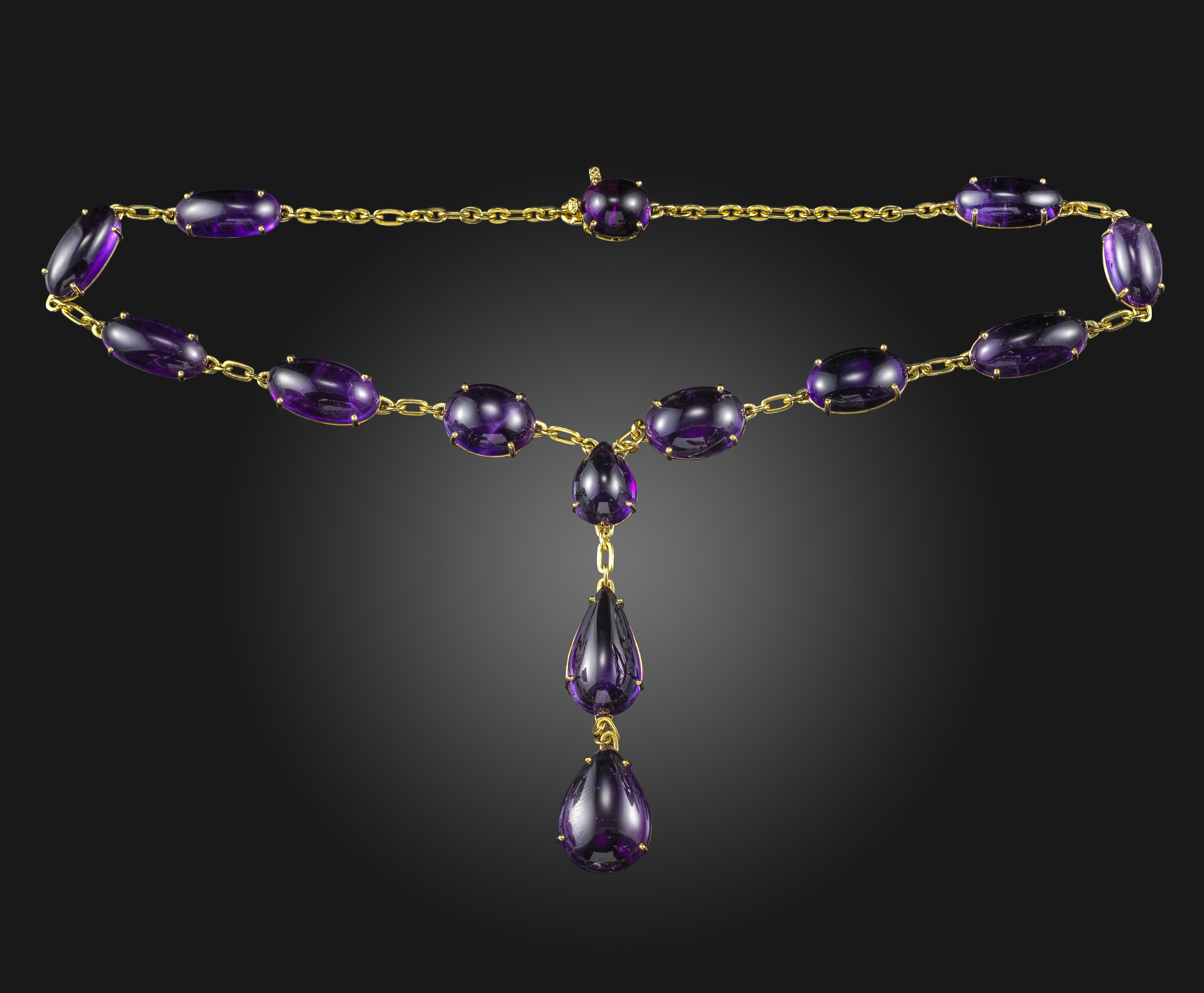 An amethyst-set gold necklace, set with oval and pear-shaped amethyst cabochons in gold mounts, 40cm long, drop section 8cm high