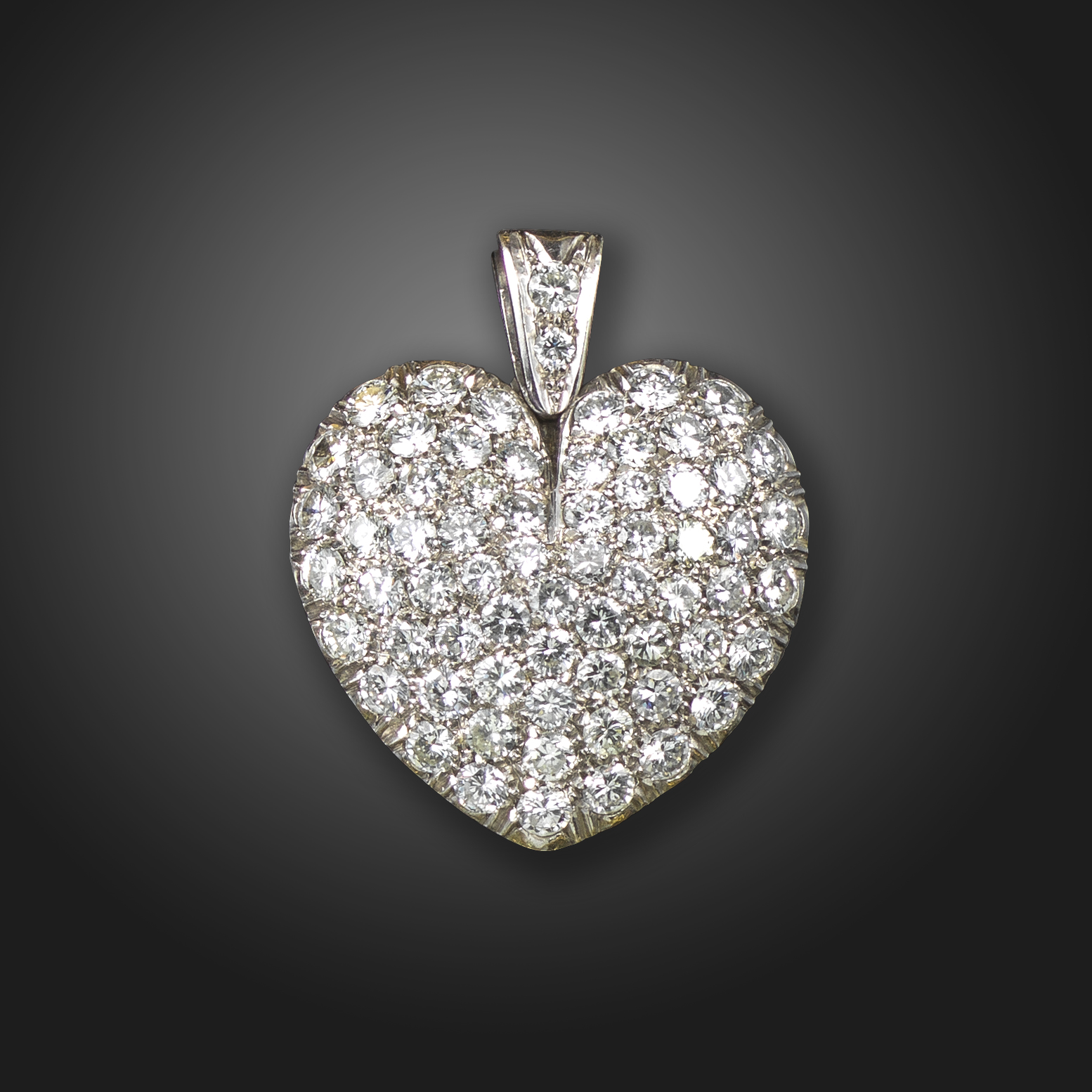 A diamond heart pendant, pave-set with graduated round brilliant-cut diamonds in platinum, 2.8cm wide