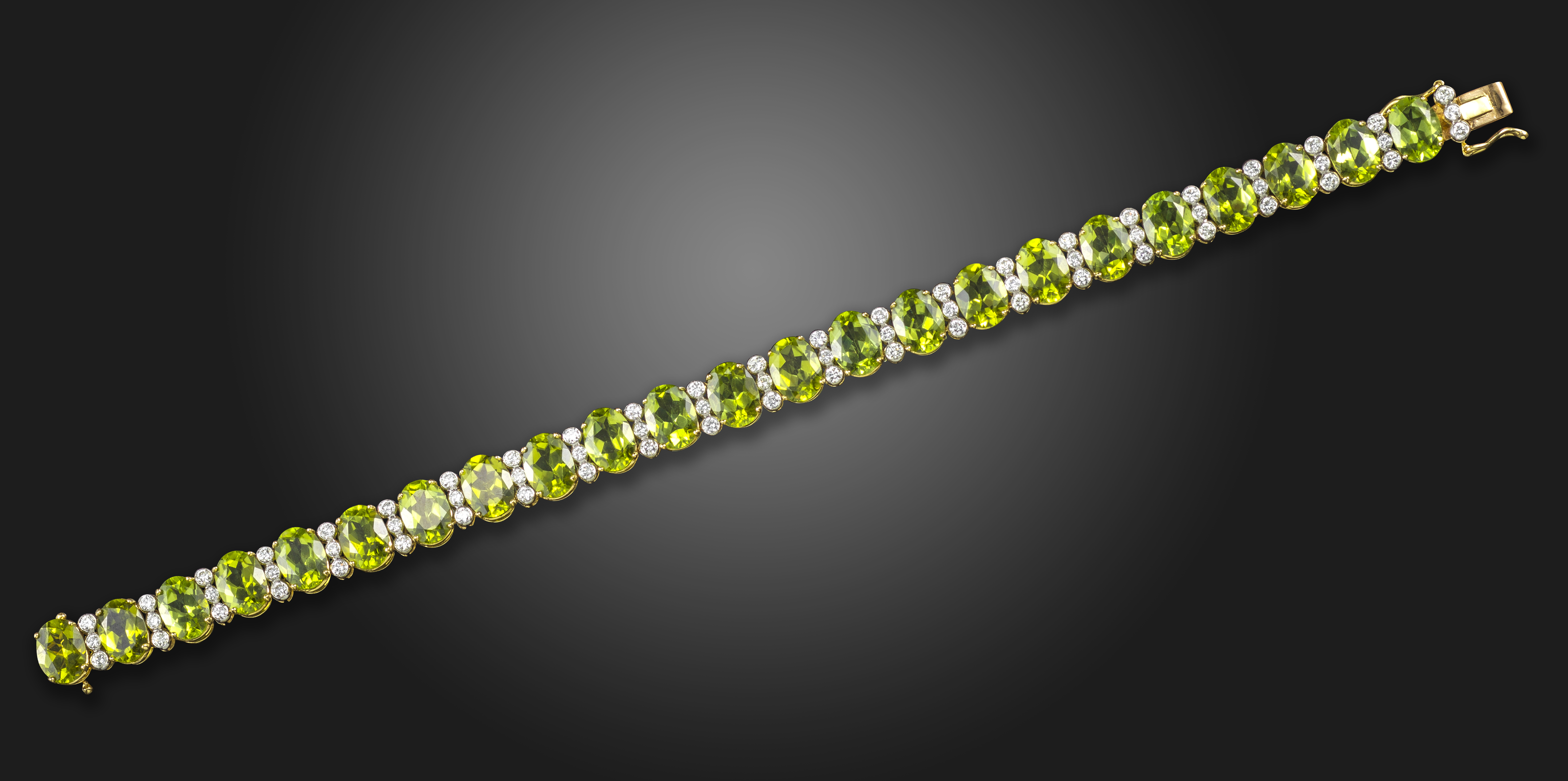 A peridot and diamond bracelet, set with oval-shaped peridots and rows of round brilliant-cut diamonds in gold, peridots approximately 28.00cts, diamonds approximately 1.75cts, 18cm long