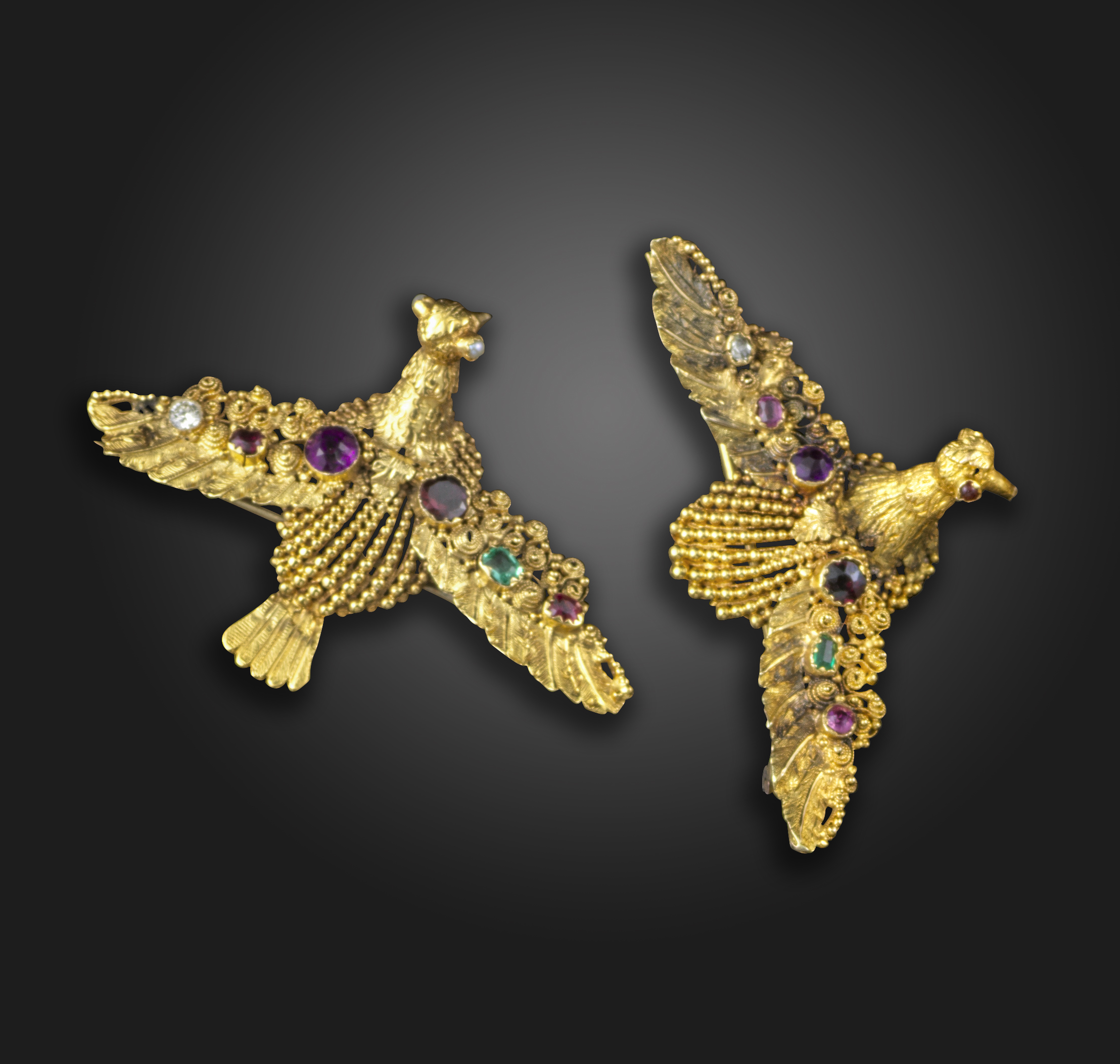 A pair of Regency gold acrostic dove brooches, each set with a ruby, emerald, garnet, amethyst, ruby and diamond spelling the word 'REGARD' within gold pellet and cannetille surround forming the dove's body in yellow gold, 4.8 and 5cm wide