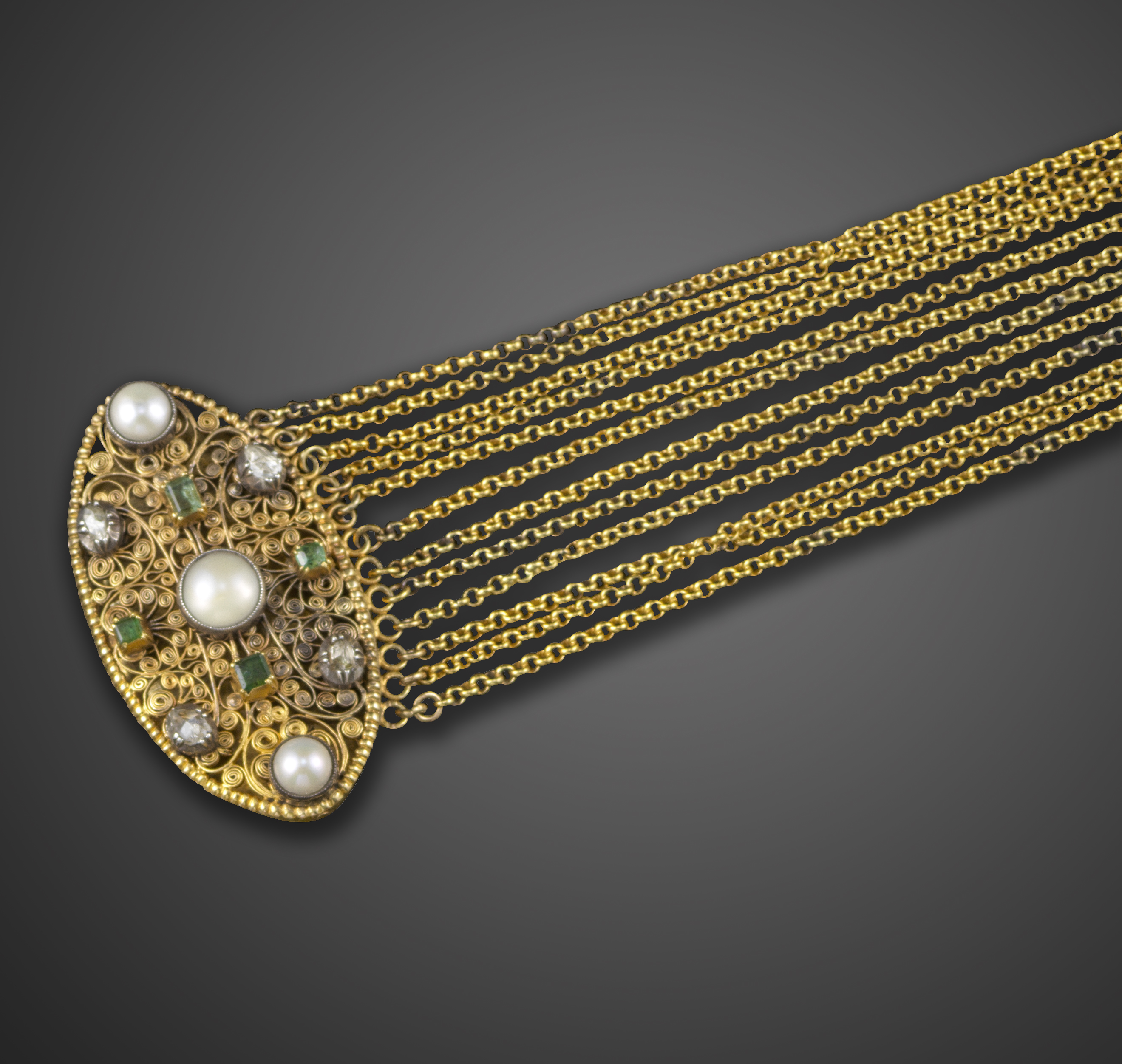 A Regency gold collar necklace, the lozenge-shaped panel set with pearls, emeralds and diamonds in silver and gold collets on gold cannetille ground, set on a twelve-row fine-link chain choker, lozenge 4.5cm necklace 35.5 - 39cm long