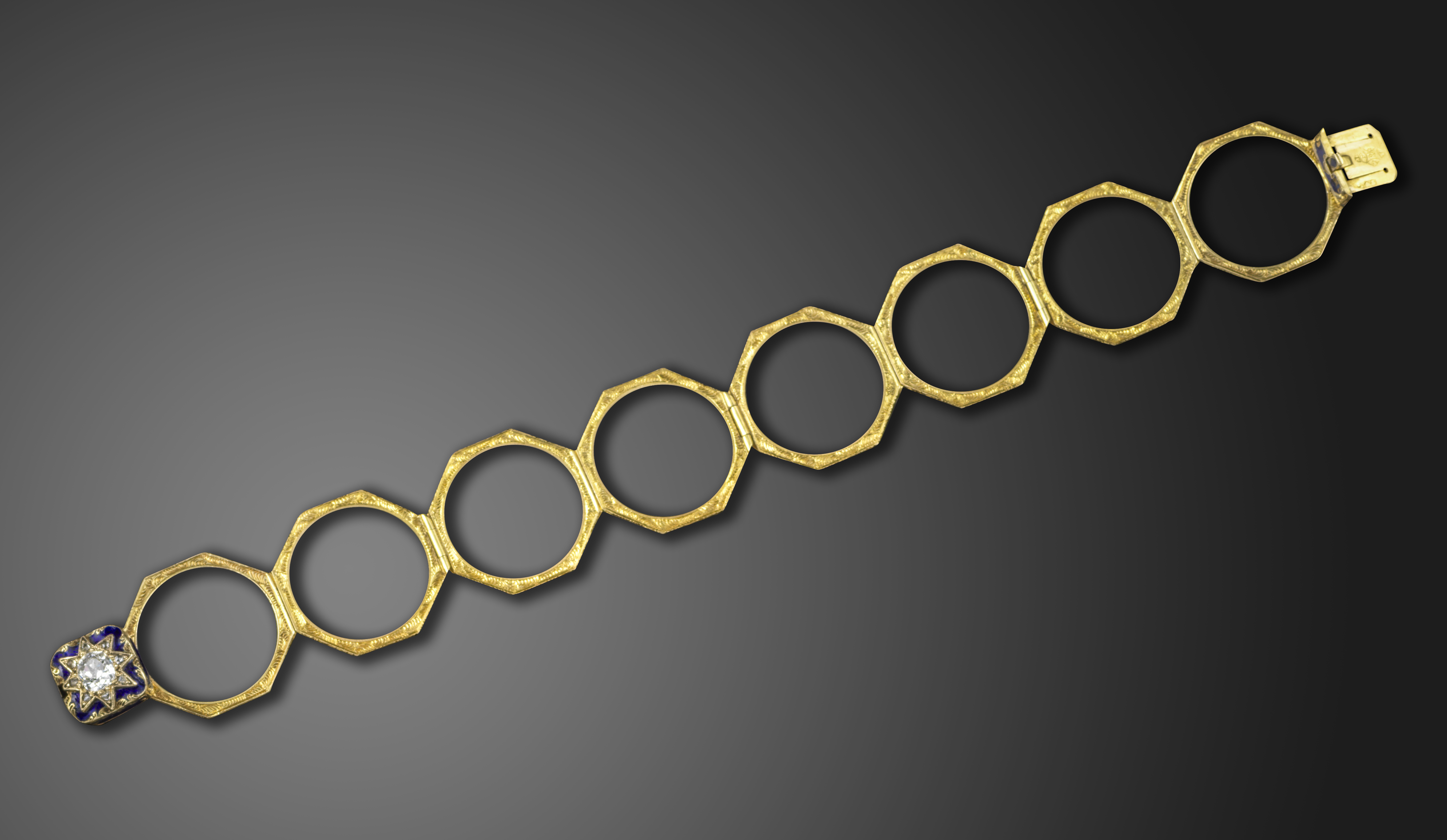 A mid 19th century blue enamel and diamond bracelet / ring, set with an old cushion-shaped diamond within diamond star border and blue enamel rectangular surround, the ring with engine turned decoration folds out to be worn as a gold bracelet, the diamond forming the clasp, with Registry mark for 1848, ring size M, bracelet 17.2cm long, case