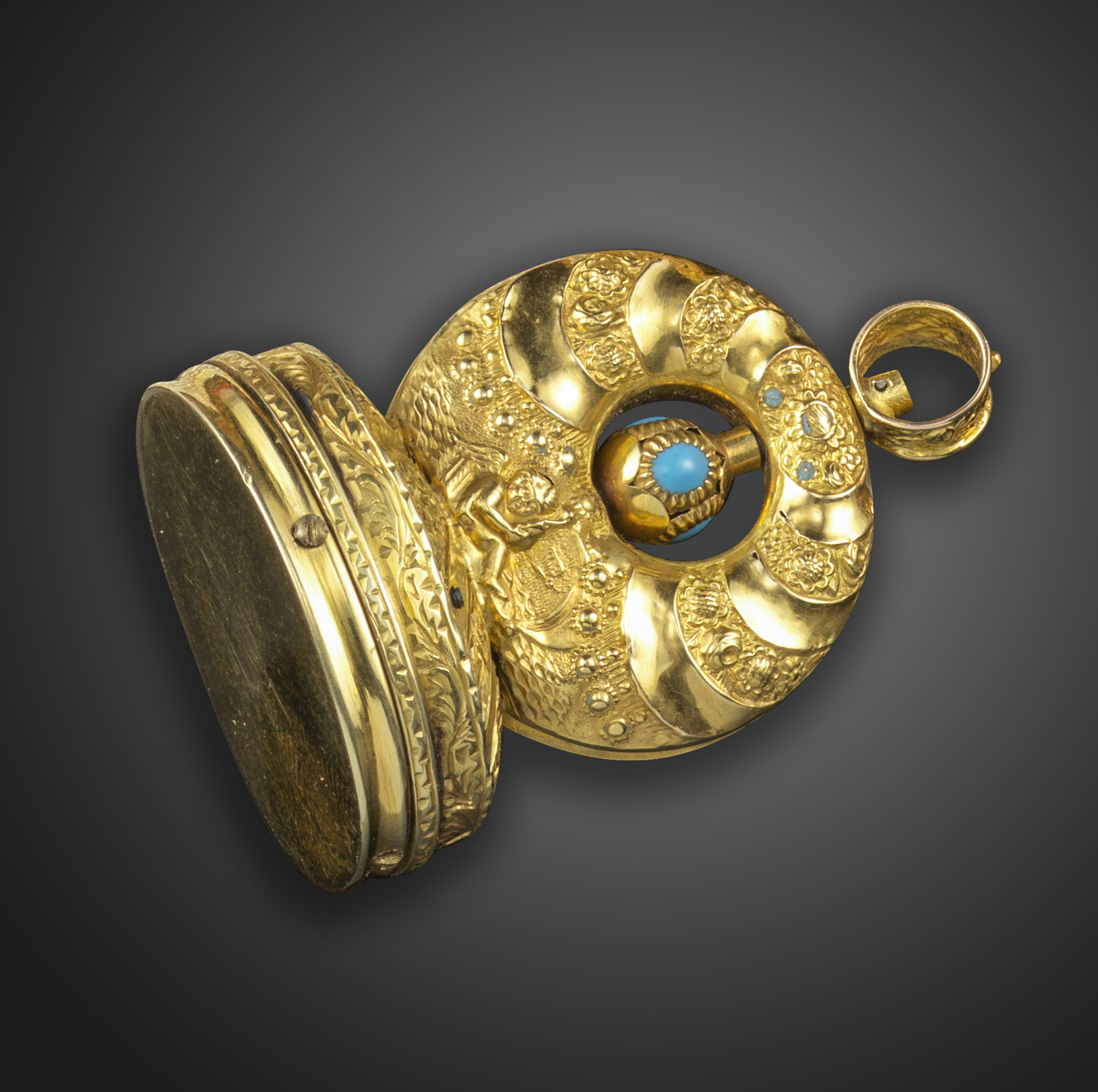 A Regency gold musical fob seal, with foliate chased and engraved decoration, depicting a seated infant Cupid with Psyche in gold (with remnants of blue enamel), central winding stem set with turquoise-set globe, oval base with musical mechanism activated by a slide, 4.6cm high, 27g