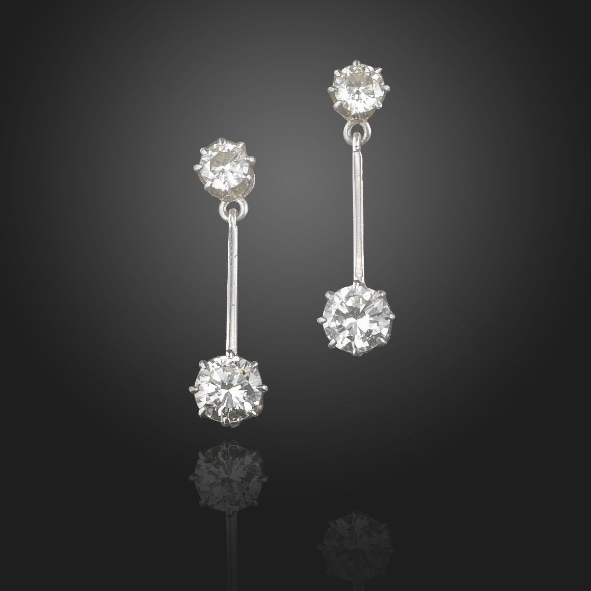 A pair of diamond drop earrings, each circular-cut diamond suspends a larger circular-cut diamond on a knife-edge link in white gold, post fittings, 2.2cm high